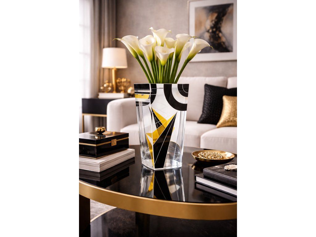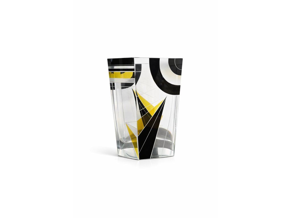 Masivní broušená váza z hutního skla s geometrickým dekorem ve stylu Art Deco. Výška 27,5 cm, šířka 20 cm, hloubka 10,5 cm. Na horní hraně nepatrný oťuk.