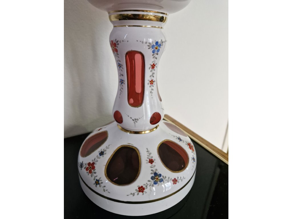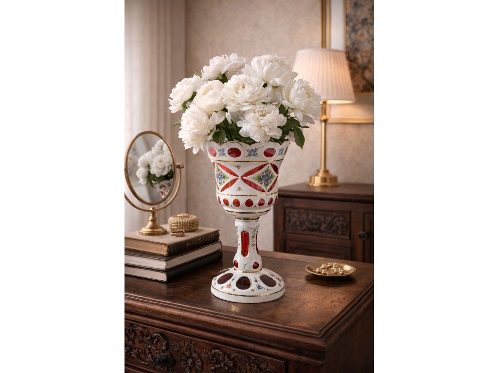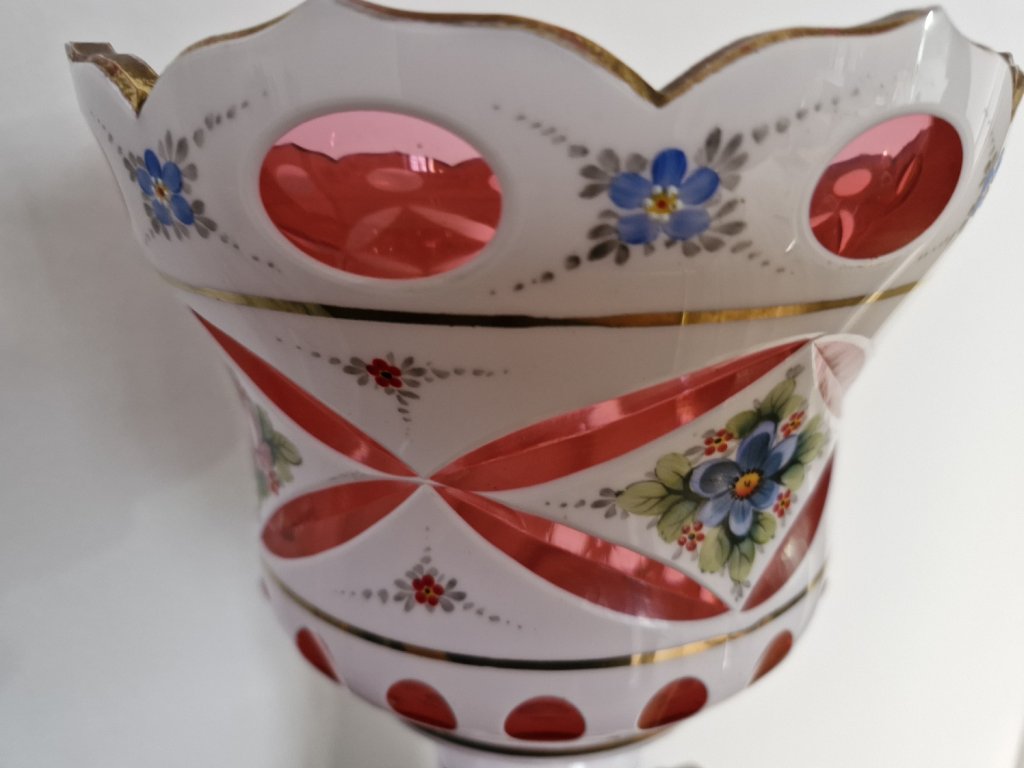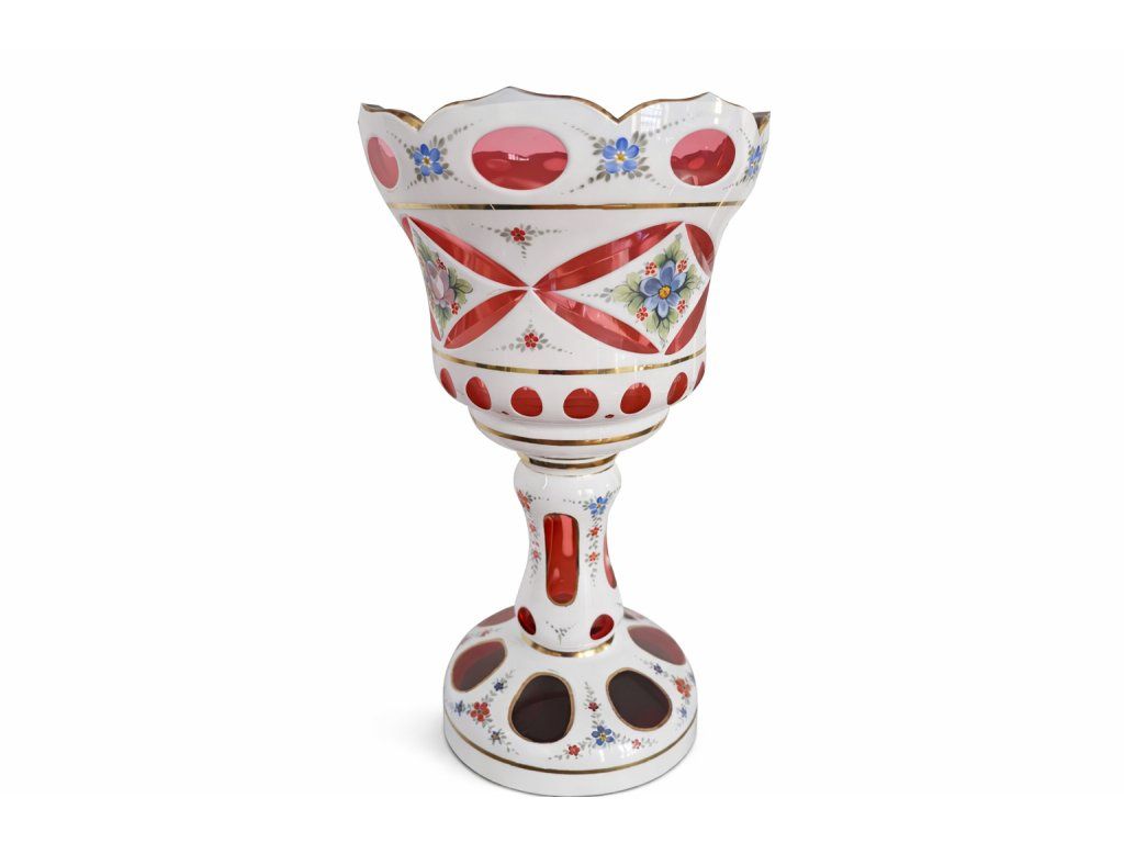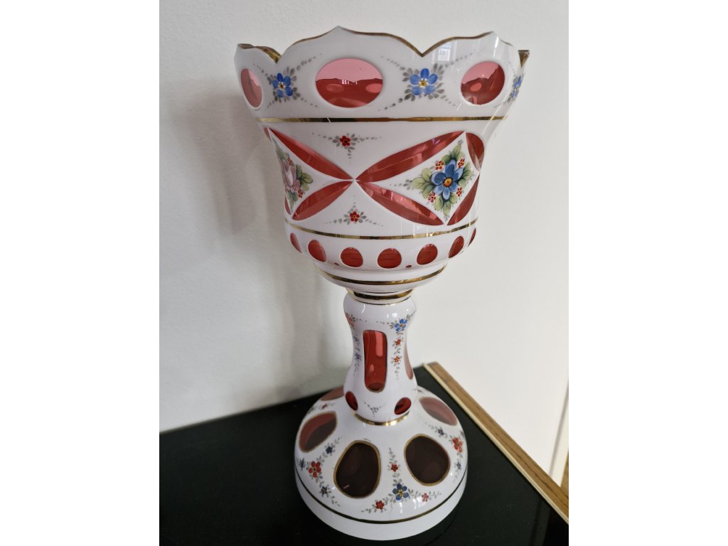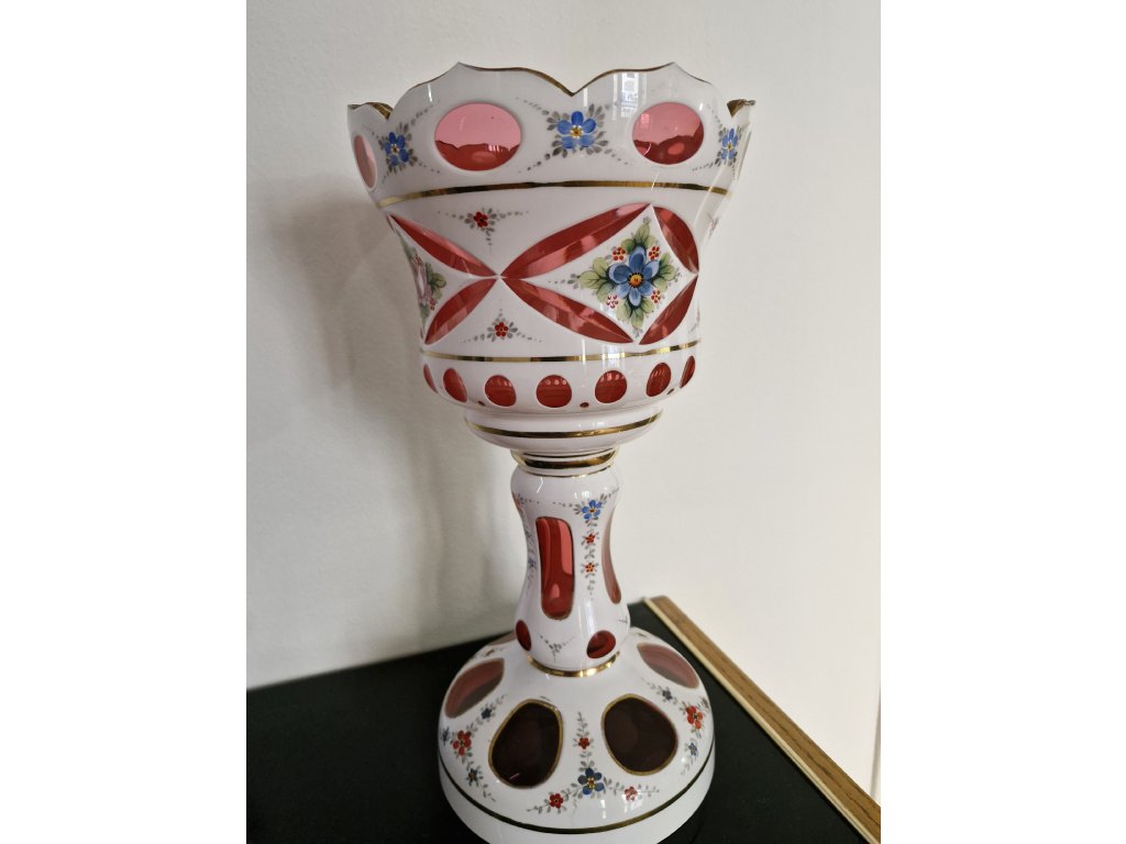 Nádherný majestátní kalich z broušeného přejímaného skla s ruční malbou, Nový Bor, polovina 20. století. Výška 33 cm. Top stav.