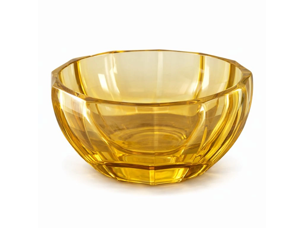 Nádherná masivní citrinová mísa z broušeného skla z produkce sklárny ŽBS, 50. léta 20. století. Výška 9 cm, délka 23 cm. Top stav.
