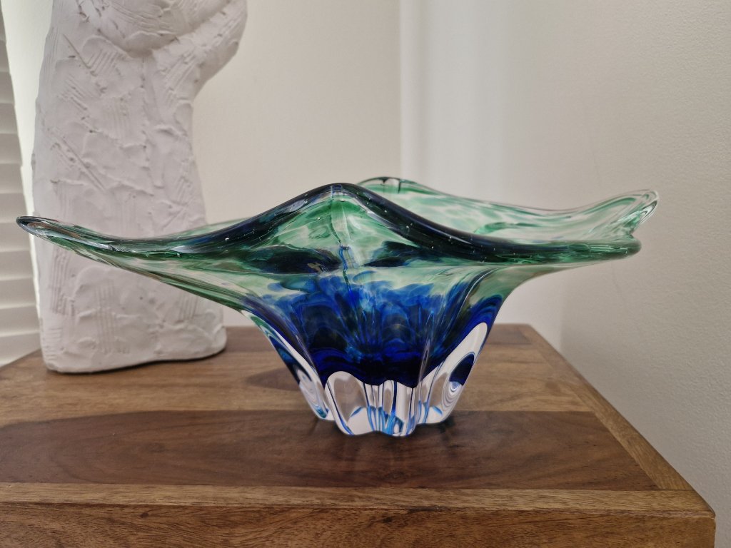Nádherná mísa z hutního skla v krásné kombinaci modré a zelené barvy se žihváním. Z produkce sklárny Egermann Nový Bor. Výška 14 cm, délka 37 cm. Na podstavě značeno. Top stav nového zboží.