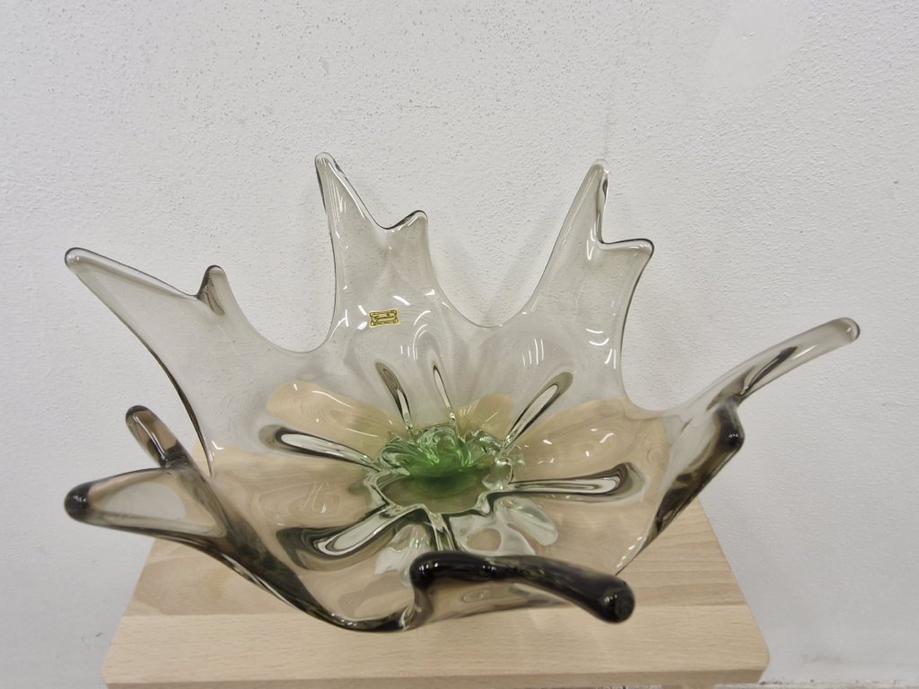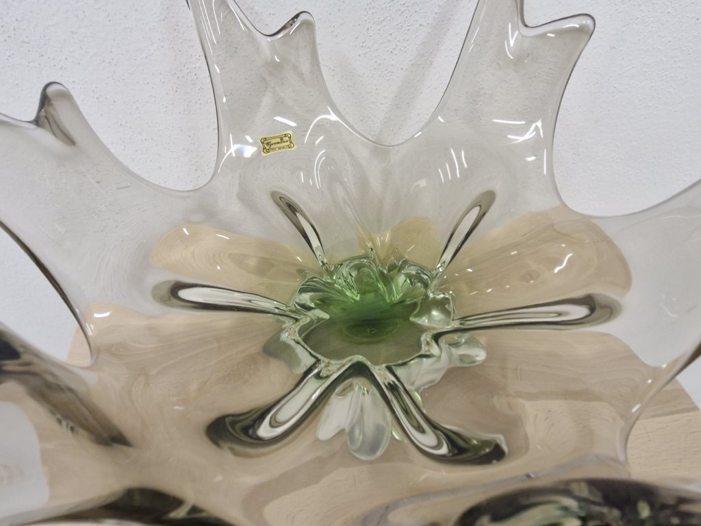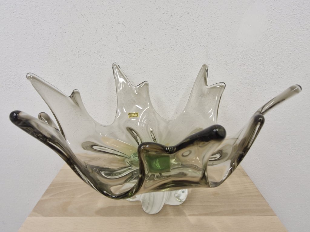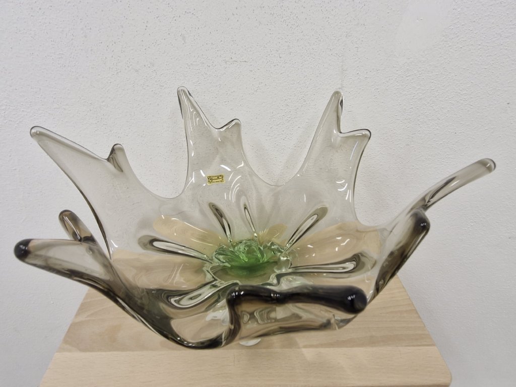 Luxusní masivní mísa z hutního skla v krásné barevné kombinaci - kouřová se zeleným středem. Z produkce sklárny Egermann Nový Bor, 90. léta 20. století. Průměr 43 cm. S původní nálepkou sklárny. Top stav nového zboží.