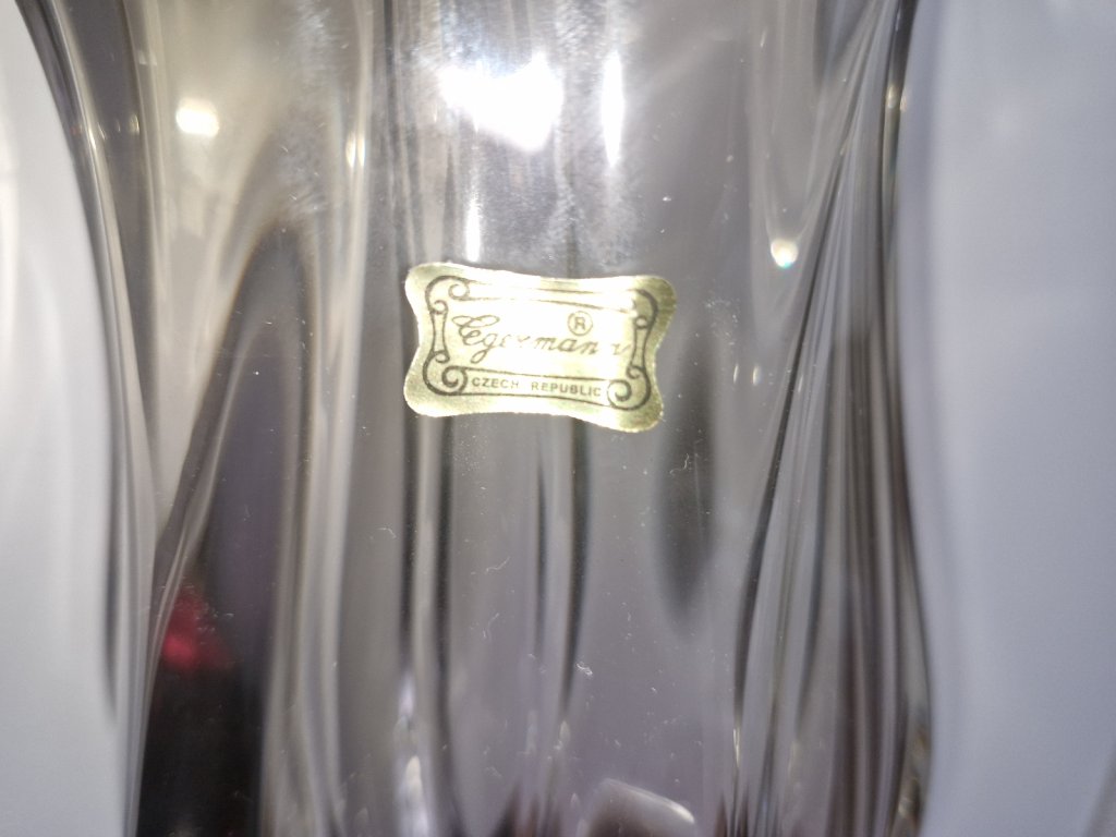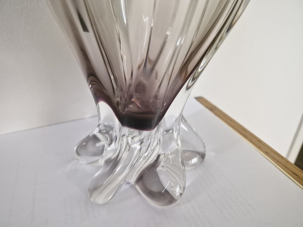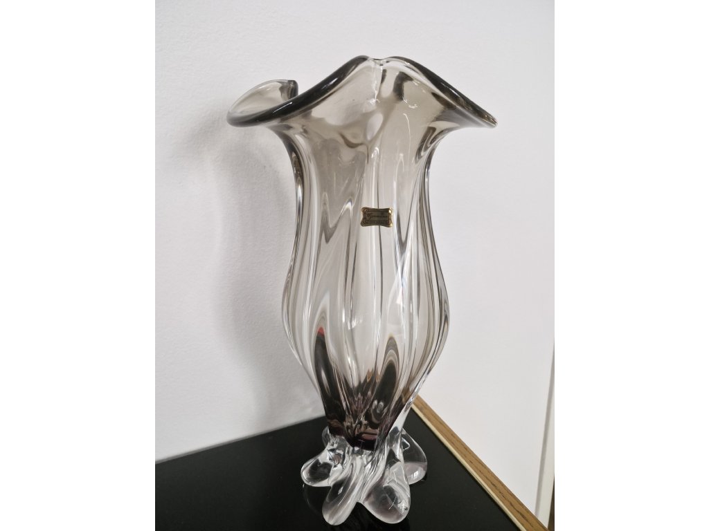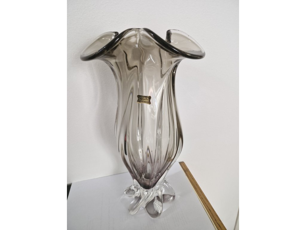 Nádherná masivní váza z hutního skla z produkce sklárny Egermann Nový Bor, 90. léta 20. století. Dle původního návrhu Josefa Hospodky. Spodní část vázy je fialová a postupně prochází do jemně kouřové. Výška 35 cm. S původní nálepkou sklárny. Top stav nového zboží.