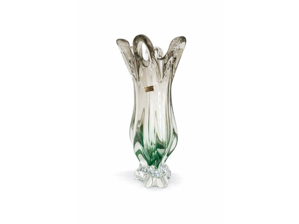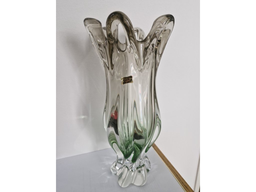 Nádherná masivní váza z hutního skla z produkce sklárny Egermann Nový Bor, 90. léta 20. století. Dle původního návrhu Josefa Hospodky. Spodní část vázy je zelená a postupně prochází do jemně kouřové. Výška 36 cm. S původní nálepkou sklárny. Top stav nového zboží.