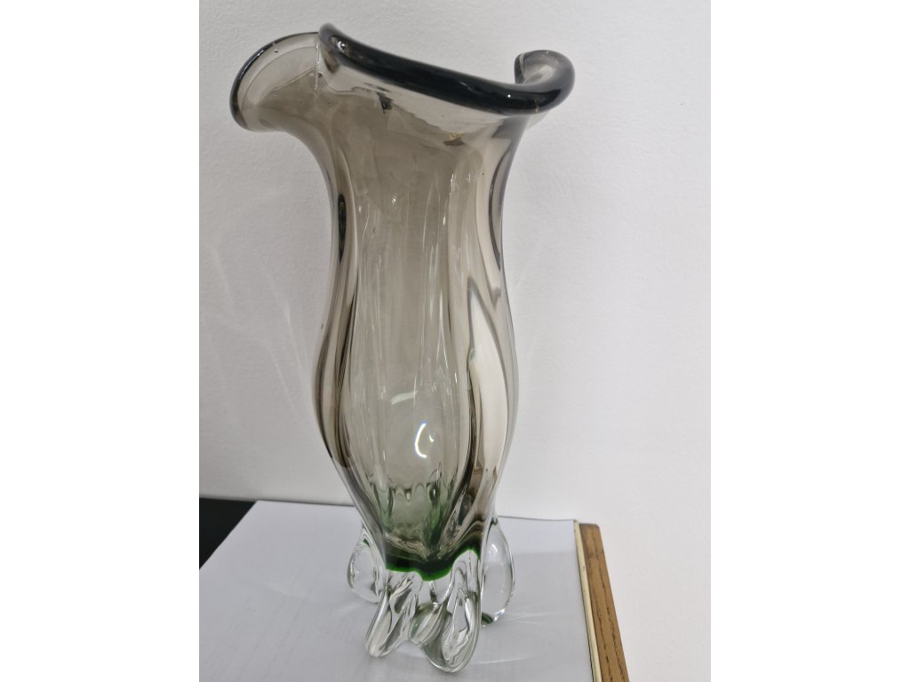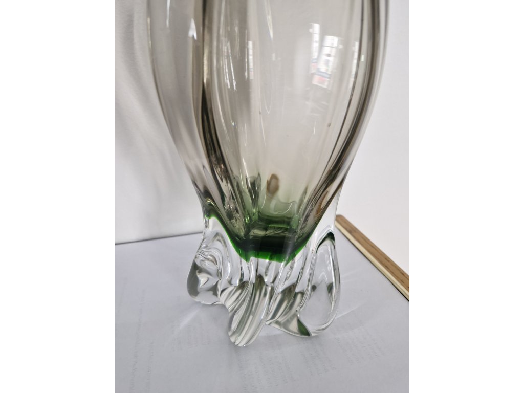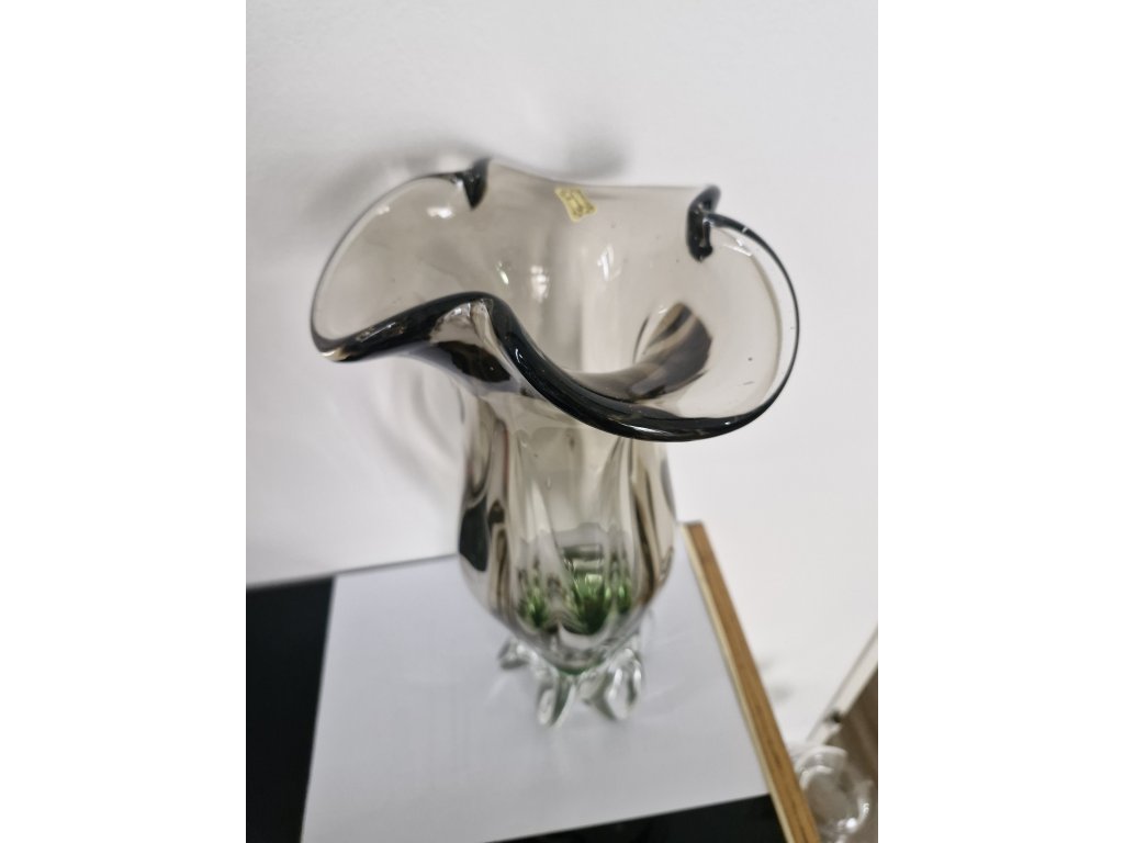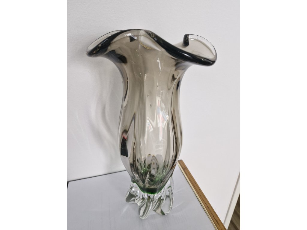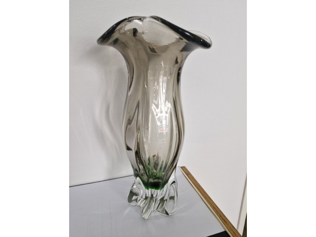 Nádherná masivní váza z hutního skla z produkce sklárny Egermann Nový Bor, 90. léta 20. století. Spodní část vázy je zelená a postupně prochází do jemně kouřové. Výška 35 cm. S původní nálepkou sklárny. Top stav nového zboží.