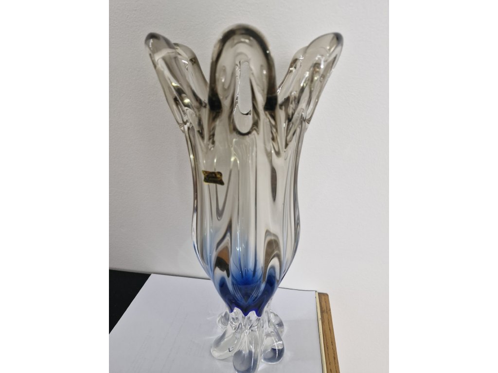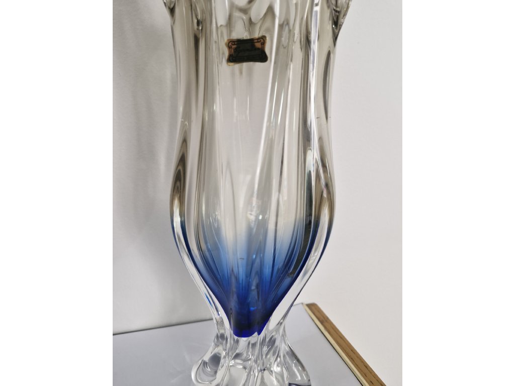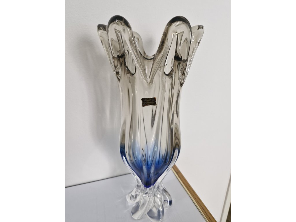 Nádherná masivní váza z hutního skla z produkce sklárny Egermann Nový Bor, 90. léta 20. století. Spodní část vázy je modrá a postupně prochází do jemně kouřové. Výška 36 cm. S původní nálepkou sklárny. Top stav nového zboží.