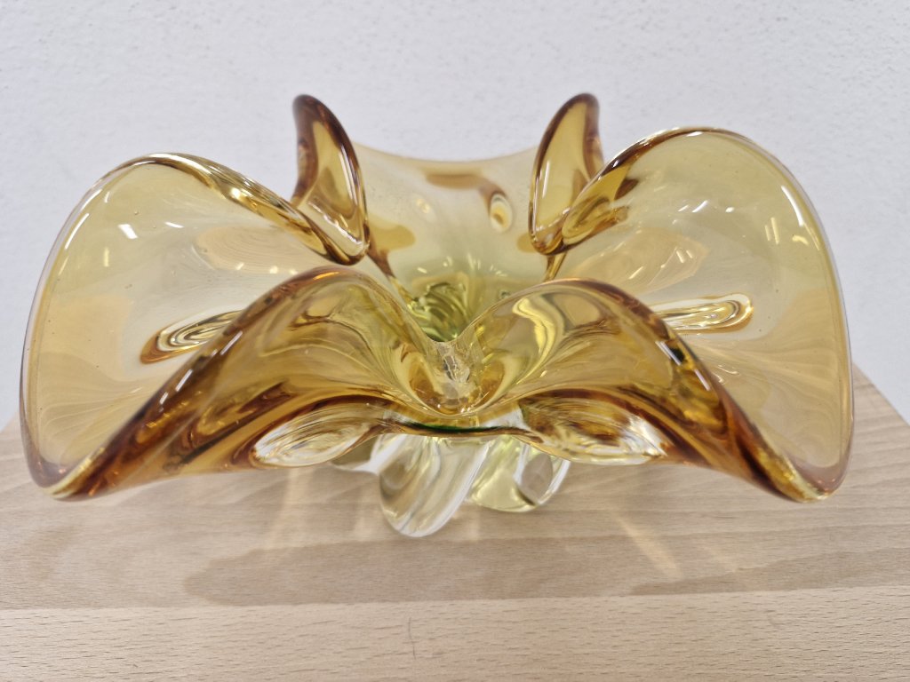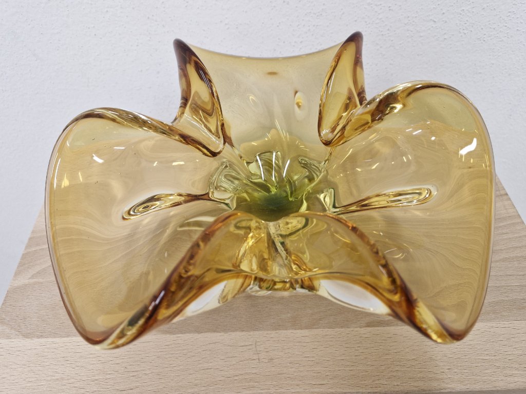 Nádherná mísa z hutního skla v krásné barevné kombinaci - ambrová se zeleným středem. Z produkce sklárny Egermann Nový Bor, 90. léta 20. století. Průměr 27 cm. S původní nálepkou sklárny. Top stav nového zboží.