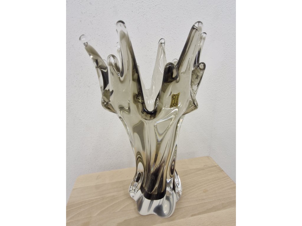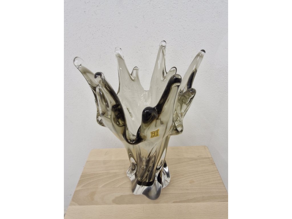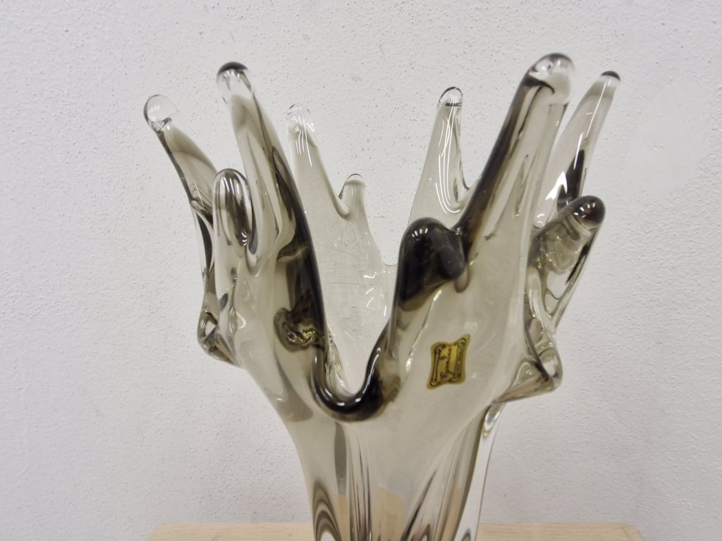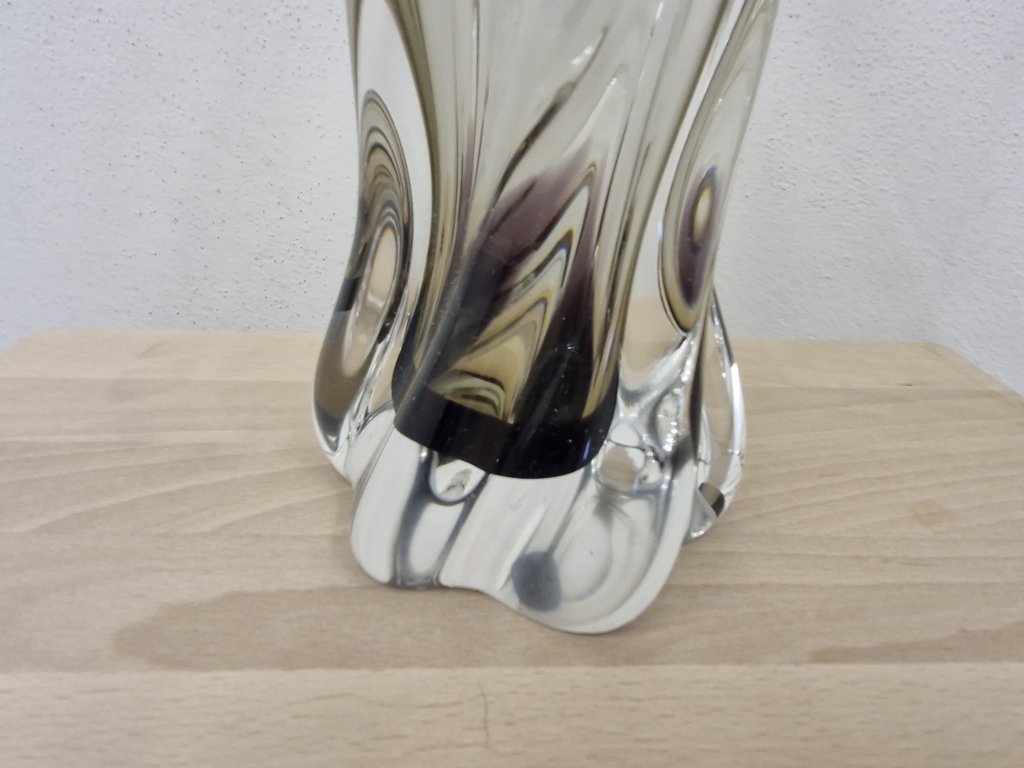 Luxusní masivní váza z hutního skla v krásné barevné kombinaci - kouřová s ametystovým středem. Z produkce sklárny Egermann Nový Bor, 90. léta 20. století. Výška 34 cm. S původní nálepkou sklárny. Top stav nového zboží.