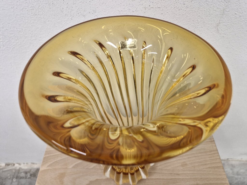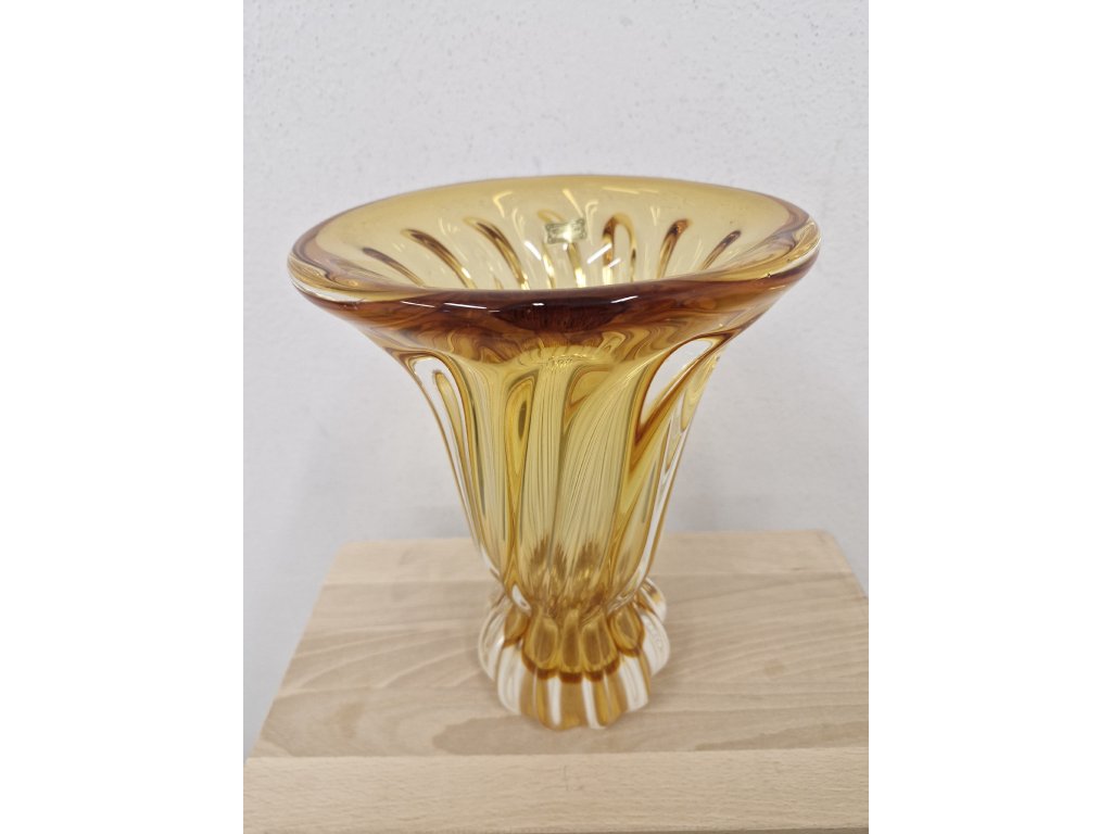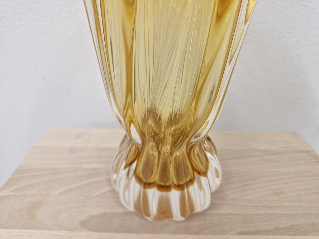 Luxusní masivní váza z hutního skla v krásné ambrové barvě. Z produkce sklárny Egermann Nový Bor, 90. léta 20. století. Výška 29 cm. S původní nálepkou sklárny. Top stav nového zboží.