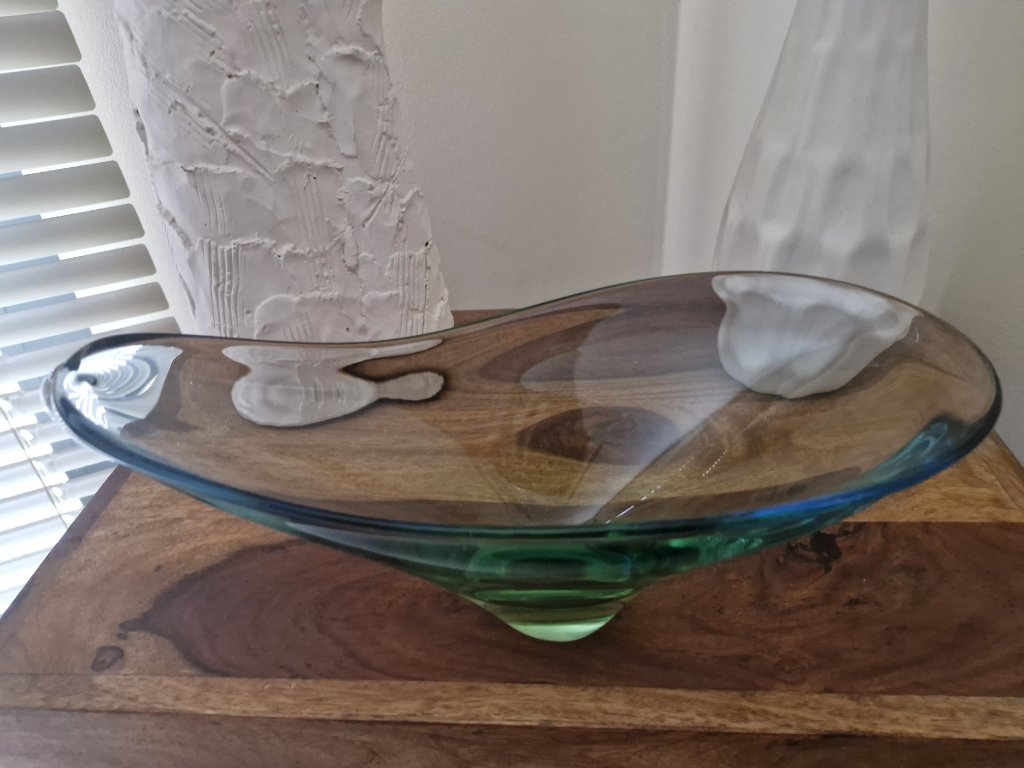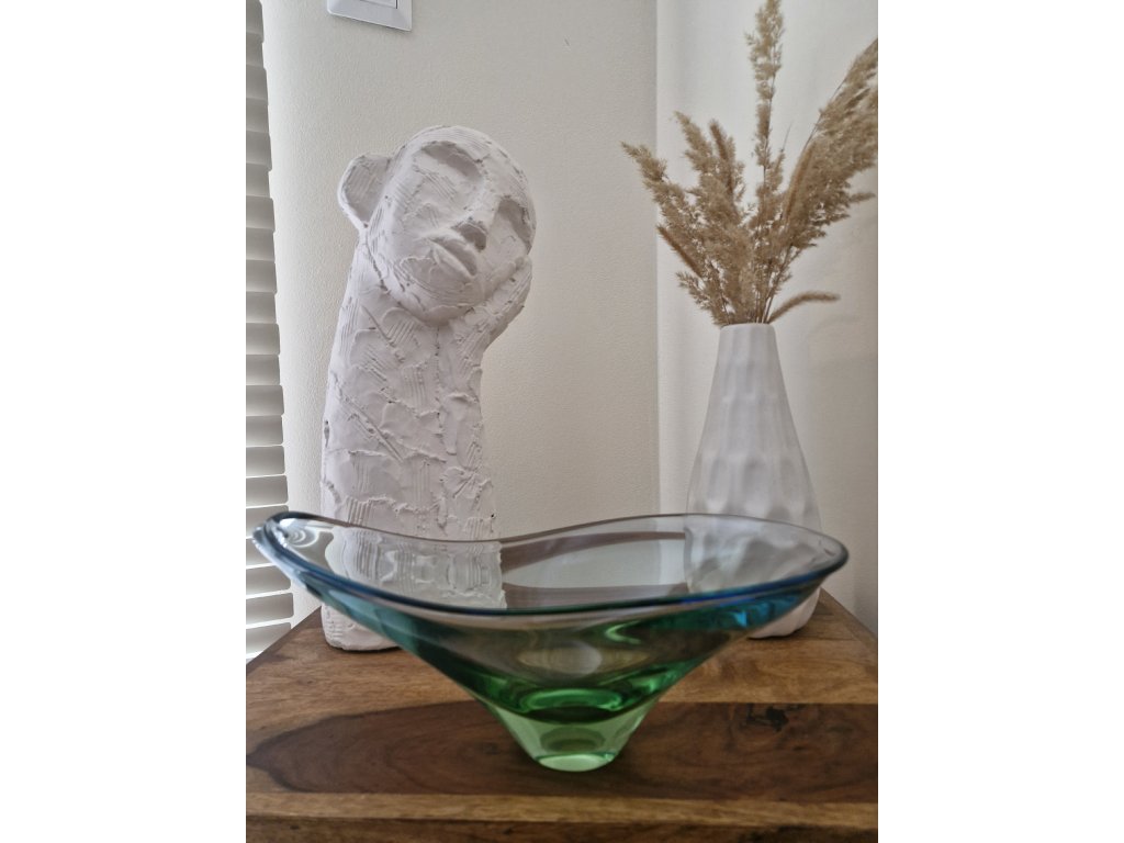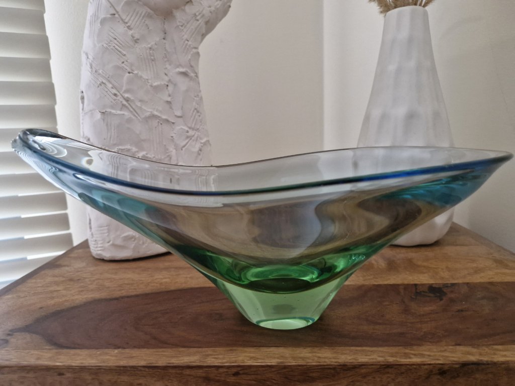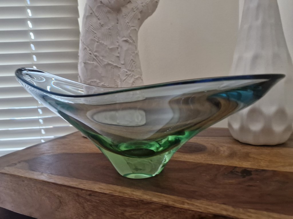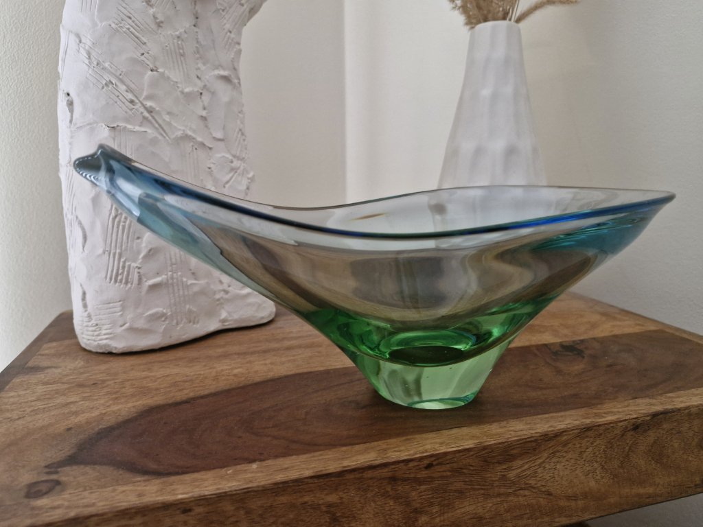 Luxusní mísa z hutního skla v nádherné modro-zelené barevné kombinaci dle autorského návrhu Emanuela Beránka, sklárna Škrdlovice, r. 1959. Výška 15 cm, délka 31 cm. Top stav.