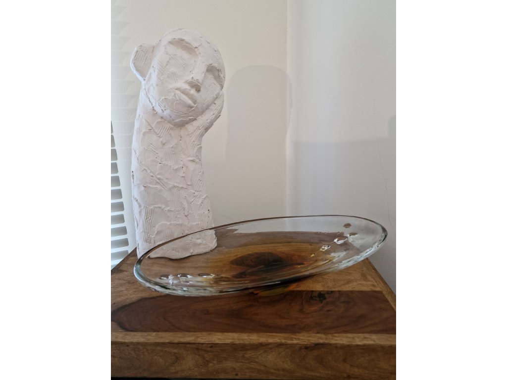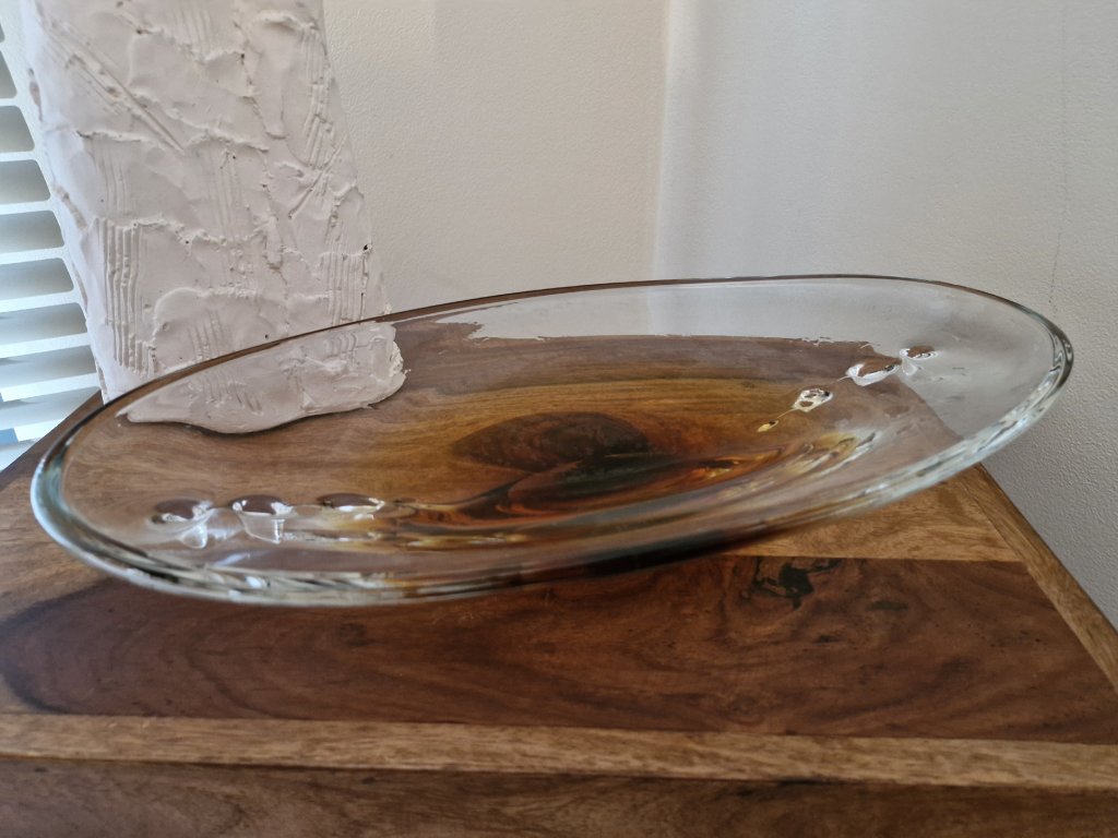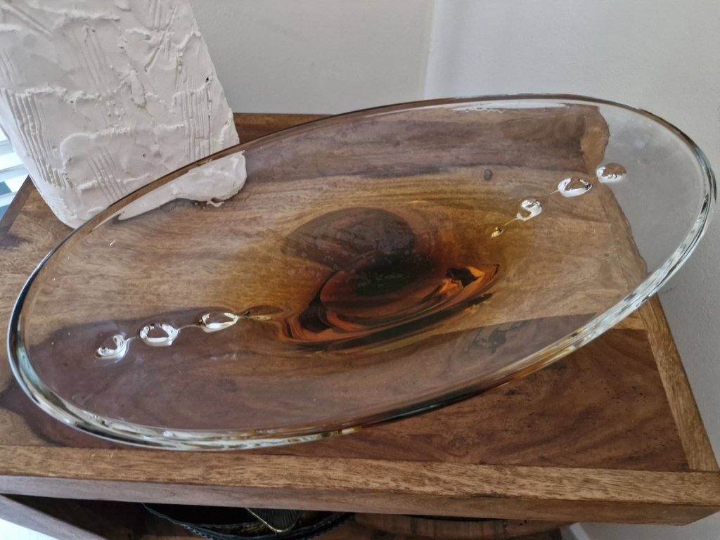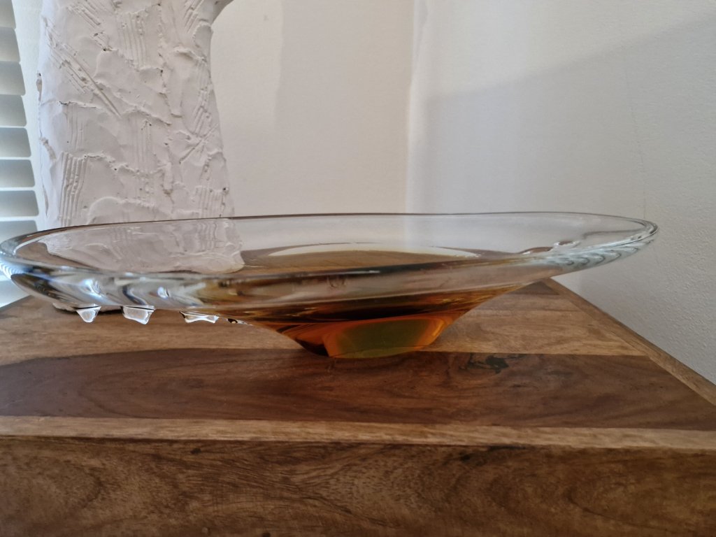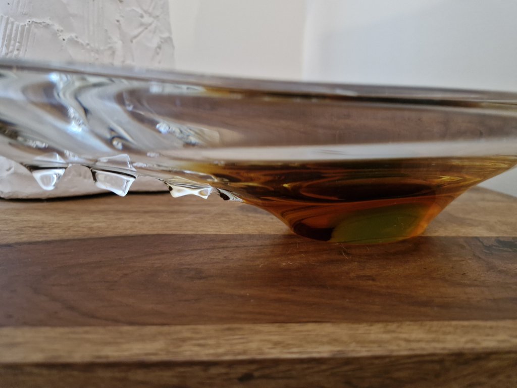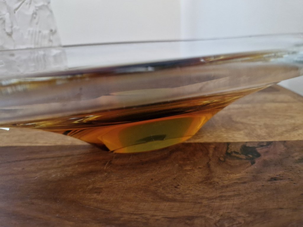 Nádherná, luxusní mísa z hutního skla dle autorského návrhu Miloslava Klingera, sklárna ŽBS, 60. léta 20. století. Jedná se o málo vídaný vzor. Jádro je ambrové se zeleným středem. Po stranách výčnělky. Výška 7 cm, délka 38 cm. Top stav. V naší nabídce rovněž popelník a váza ze stejné kolekce.