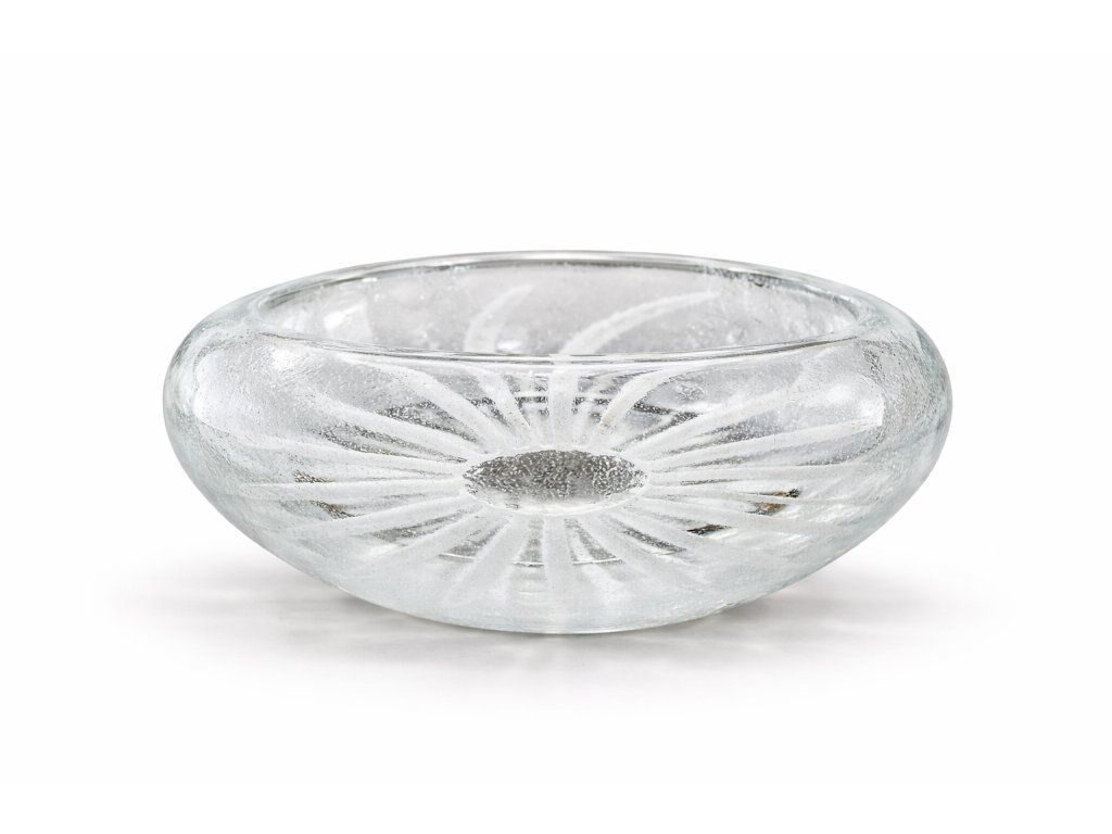 Nádherná masivní miska/popelník z čirého hutního skla s bílým dekorem připomínajícím sluneční paprsky. Z produkce sklárny Škrdlovice. Autorem návrhu je pravděpodobně Ladislav Paleček, ale nebylo možné jednoznačně určit dle vzorových knih. Výška 9 cm, délka 18 cm. Top sběratelský stav. V naší nabídce rovněž váza do sady.