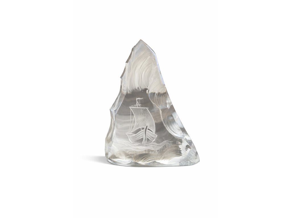 Nádherný ateliérový objekt z čirého křišťálového skla s rytinou plachetnice. Autor Václav Plátek - signováno autorem na zadní straně objektu. Výška 20 cm, šířka 15 cm. Top stav.