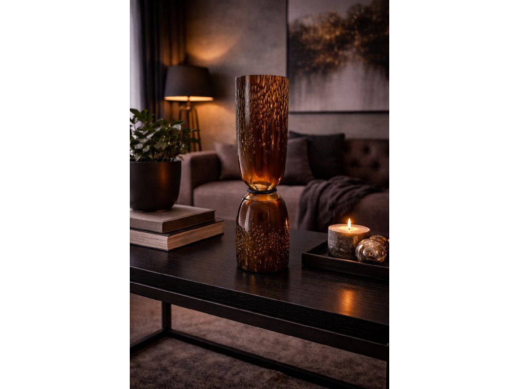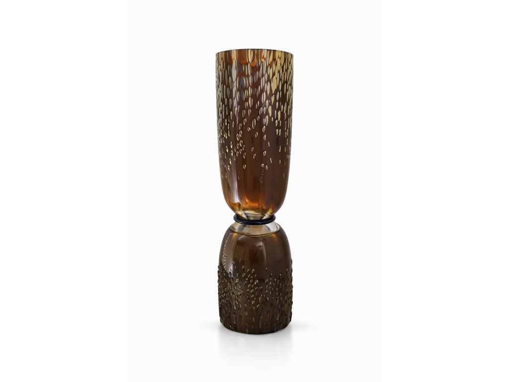 Nádherná obostranná váza z foukaného skla s plastickým dekorem, doplněna luxusním zlatavým irisováním, připomínajícím secesní vázy šumavské sklárny Loetz. Čechy, 2. pol. 20. století. Výška 34 cm. Top luxusní stav.