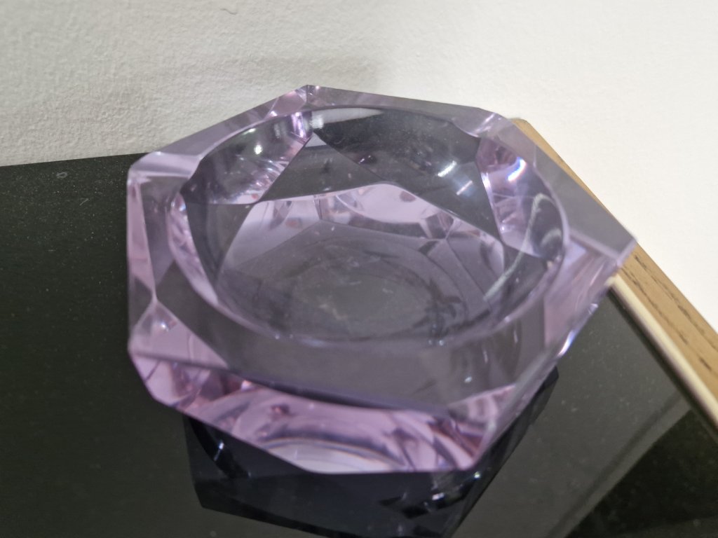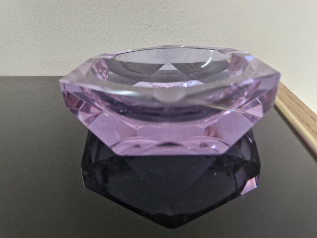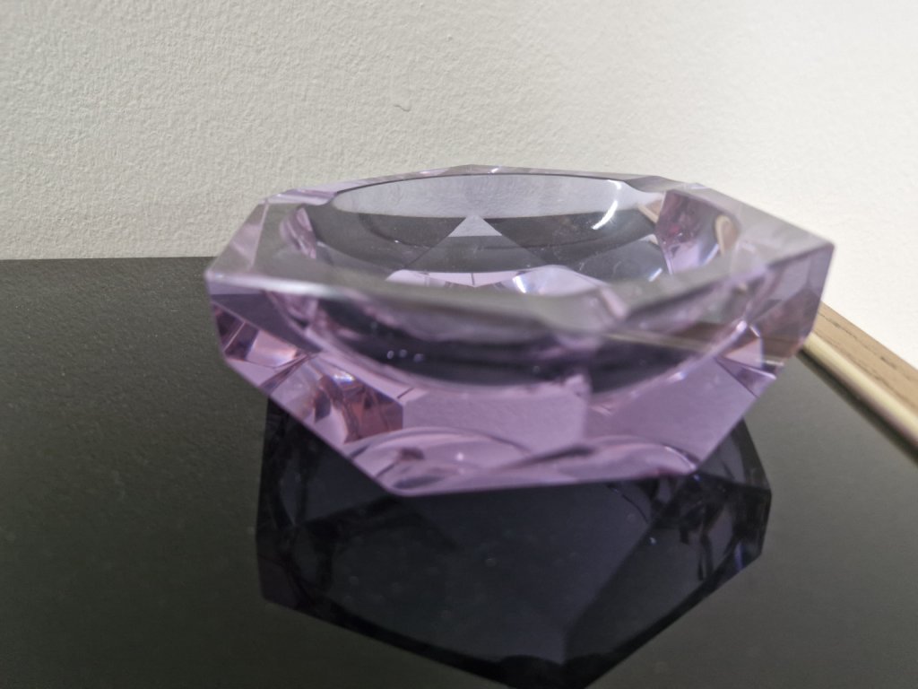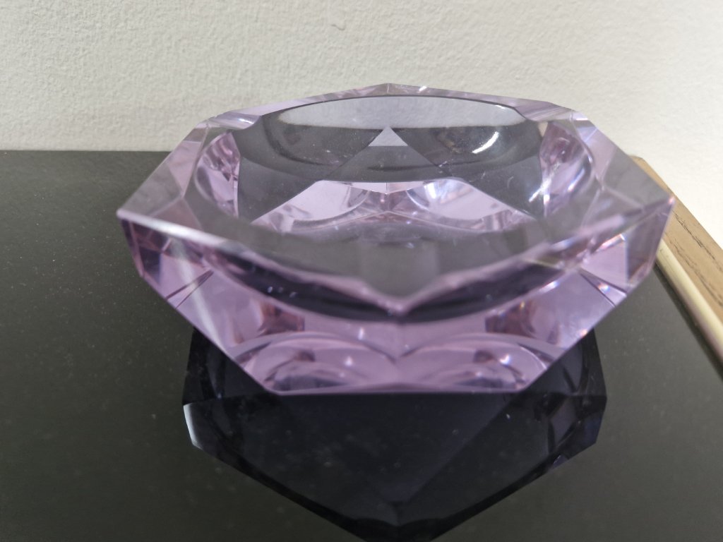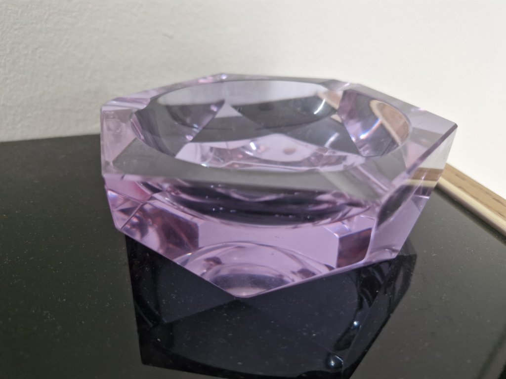 Nádherný broušený popelník z alexandritové skloviny. Autor návrhu Václav Hanuš, Jablonecké sklárny, 70. léta 20. století. Výška 4 cm, průměr 12,5 cm. Top luxusní stav.