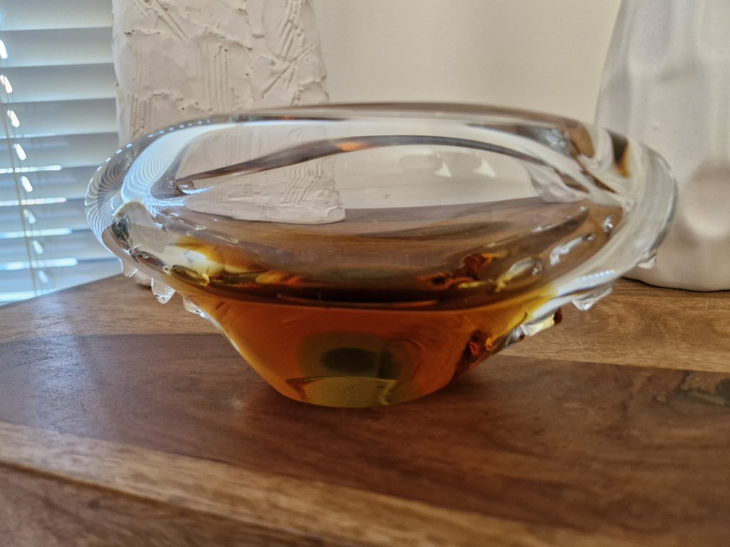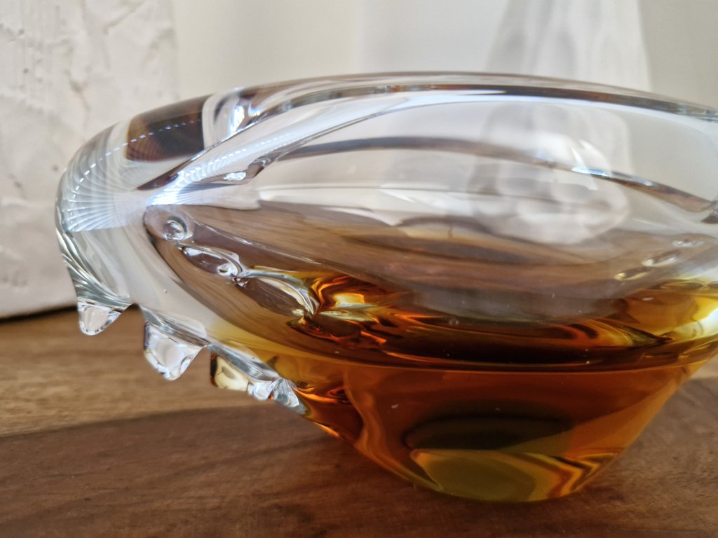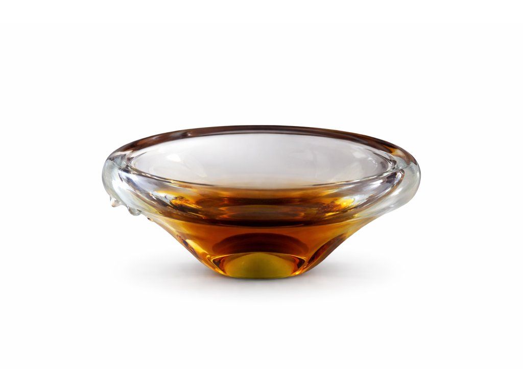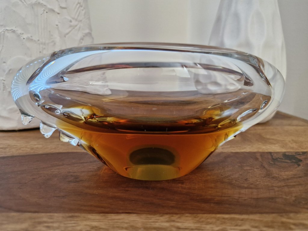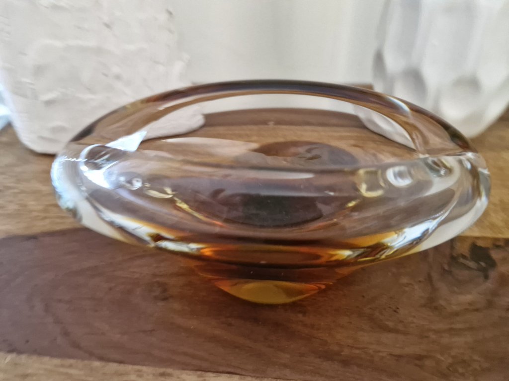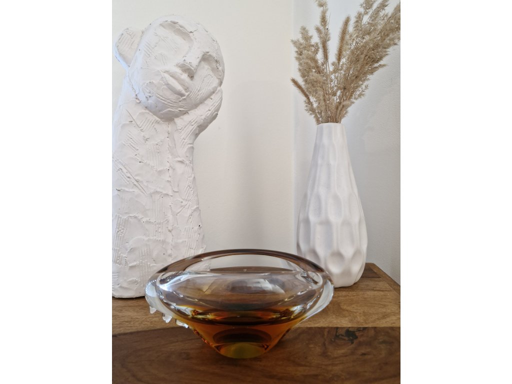 Nádherný, luxusní popelník z hutního skla dle autorského návrhu Miloslava Klingera, sklárna ŽBS, 60. léta 20. století. Jedná se o málo vídaný vzor. Jádro je ambrové se zeleným středem. Po stranách výčnělky. Výška 7,5 cm, délka 19 cm. Top stav. V naší nabídce rovněž váza a mísa ze stejné kolekce.