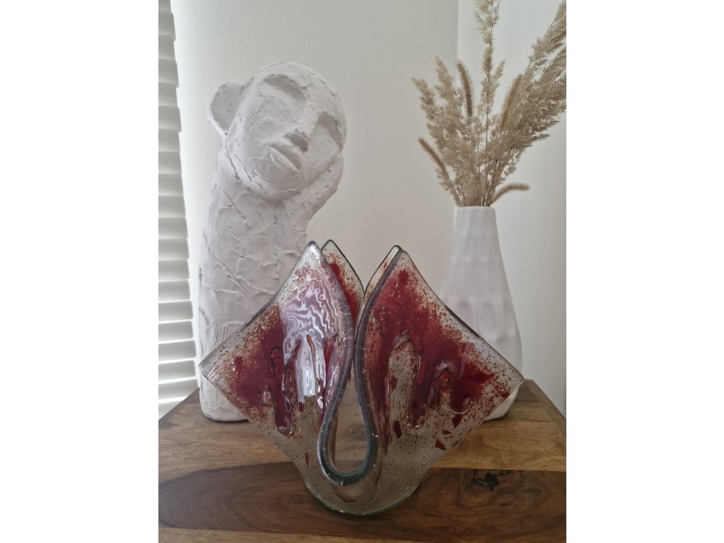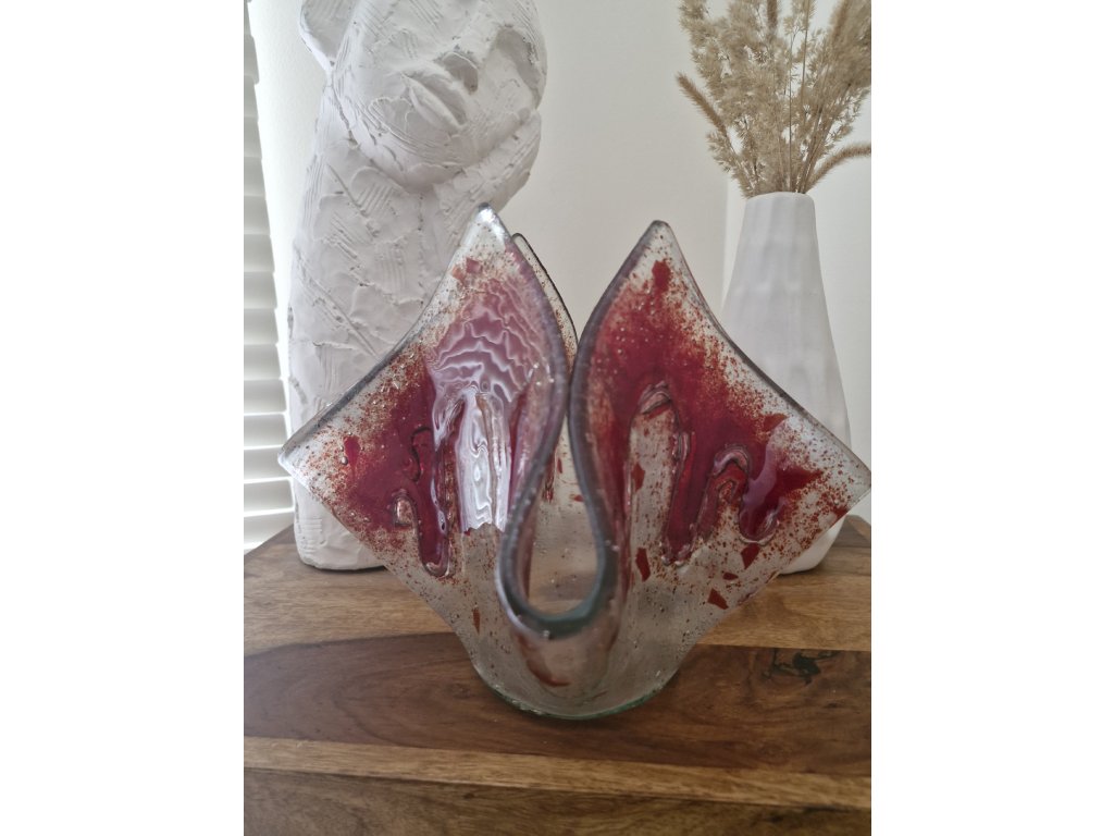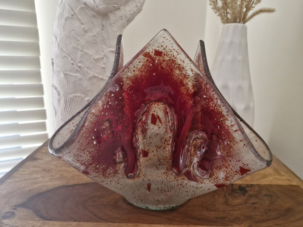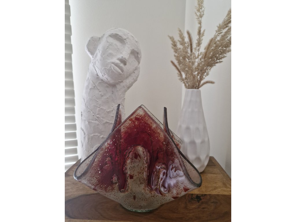 Jedinečný skleněný objekt v kombinaci čiré a rubínové skloviny. Je možné ho využít i jako netradiční vázu na kytky. Výška 21 cm, průměr 29 cm. Top stav. Nádherný dekorativní prvek do moderního interiéru :)