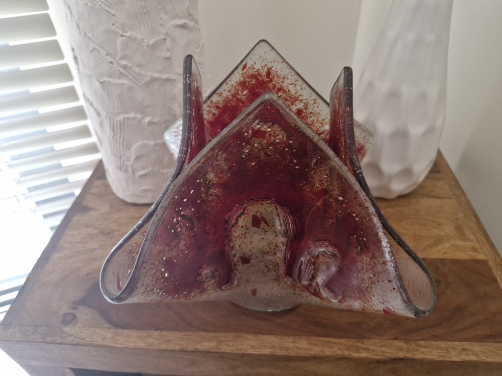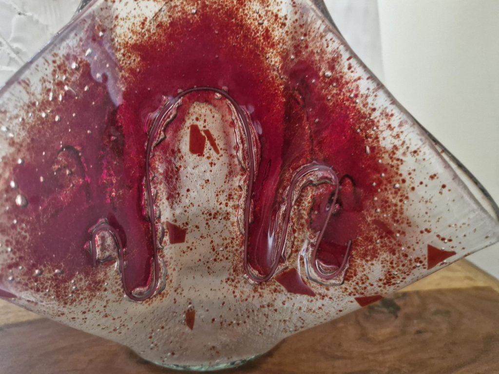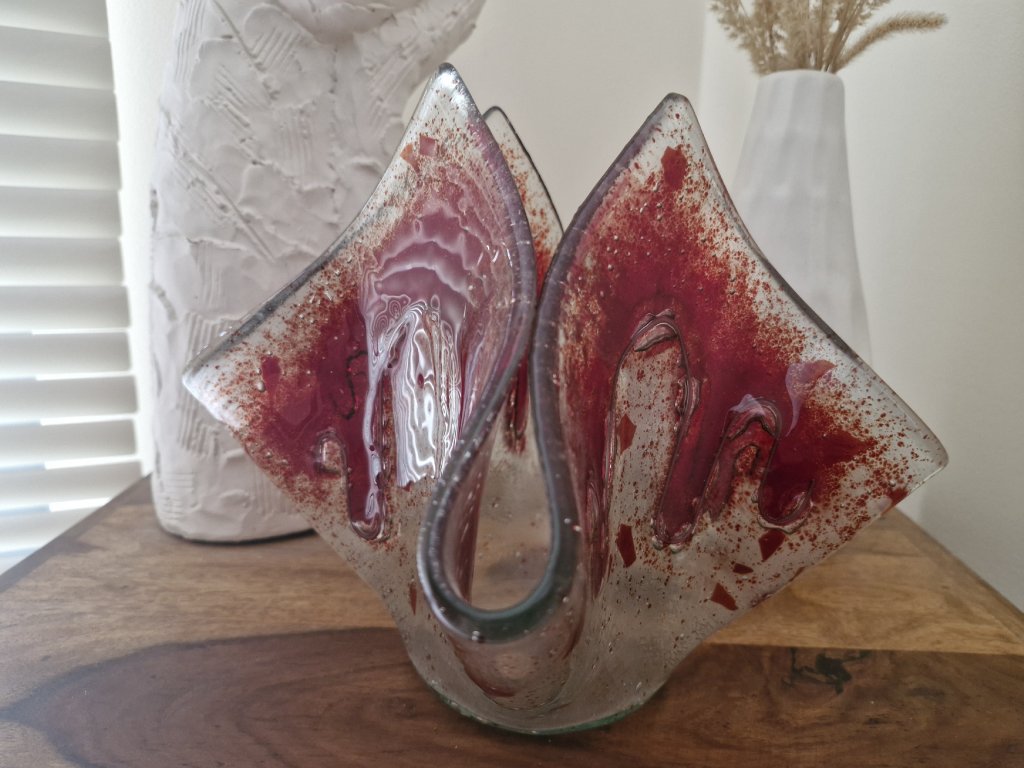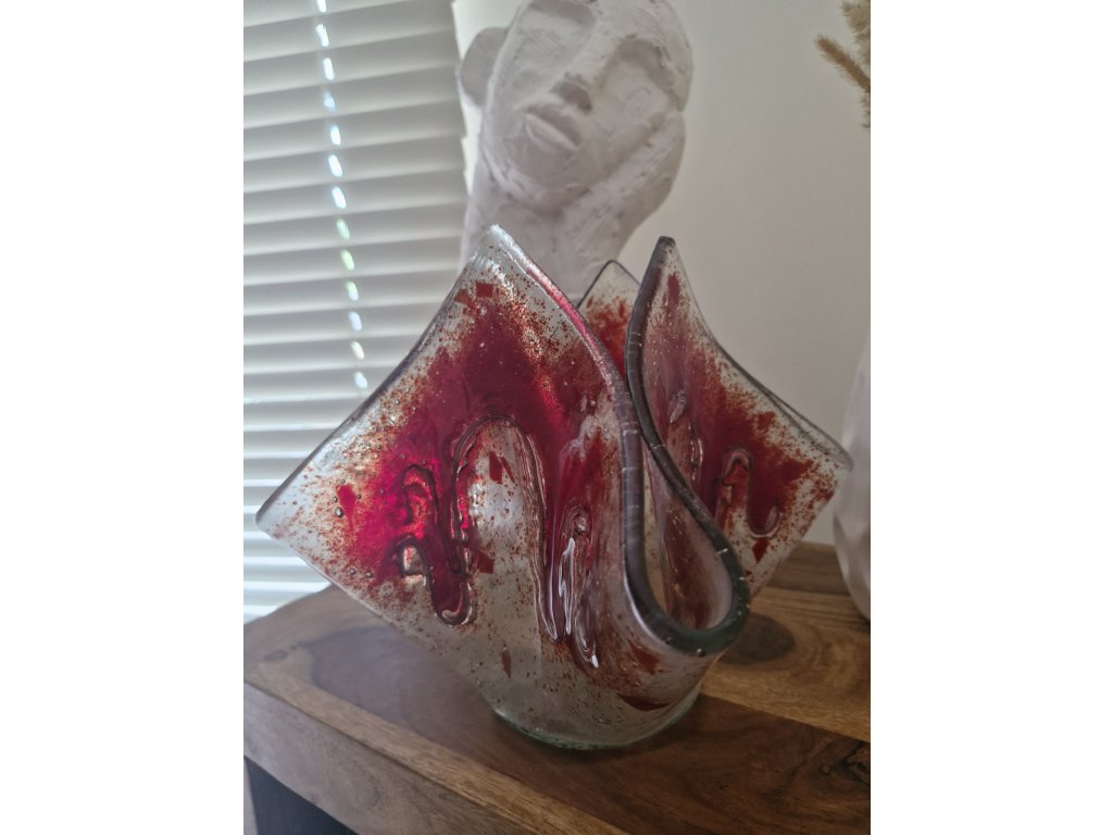 Jedinečný skleněný objekt v kombinaci čiré a rubínové skloviny. Je možné ho využít i jako netradiční vázu na kytky. Výška 21 cm, průměr 29 cm. Top stav. Nádherný dekorativní prvek do moderního interiéru :)