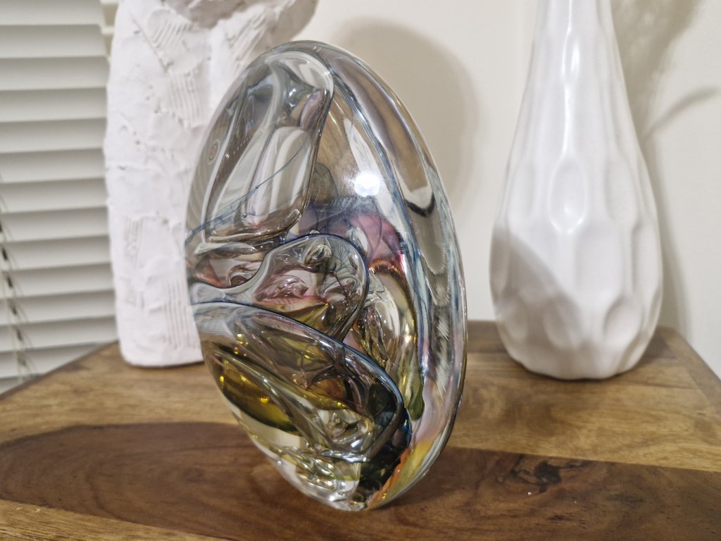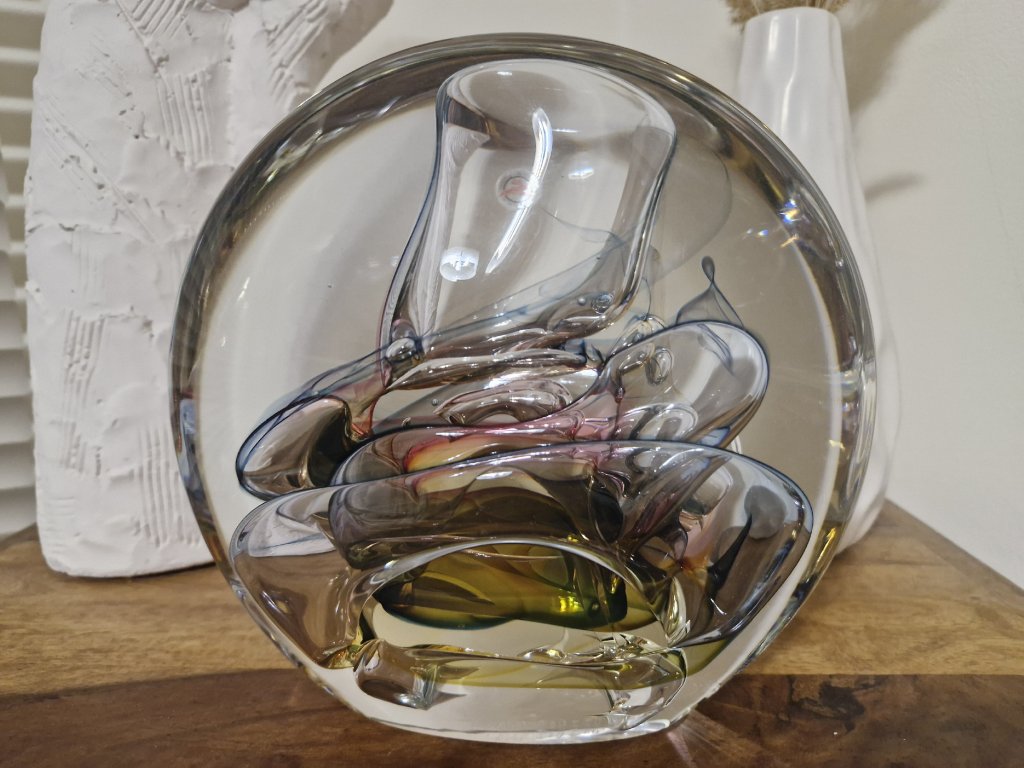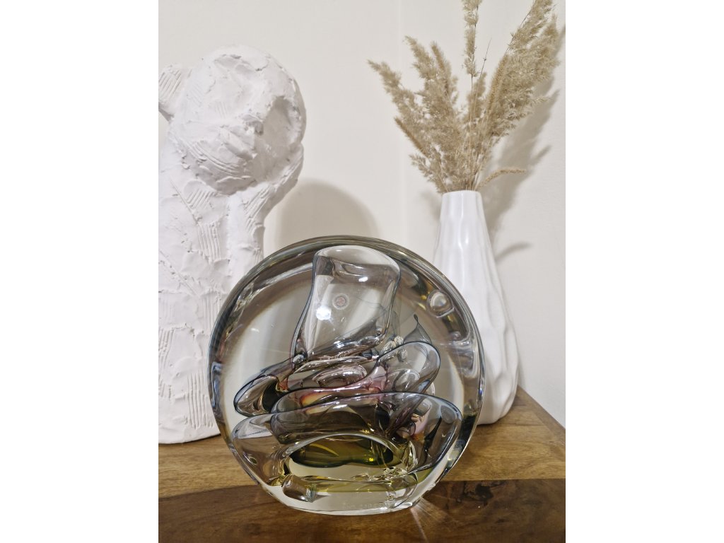 Nabízíme jedinečný skleněný objekt vyrobený ve sklárně Art Glass PRINC pro kalifornskou designovou společnost OZZARO GLASS STUDIO. Jedná se o jediný vyrobený kus v tomto designu. Výška 19 cm, průměr 21 cm. S původní nálepkou OZZARO COLLECTION. Top stav nového zboží.