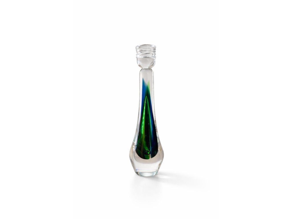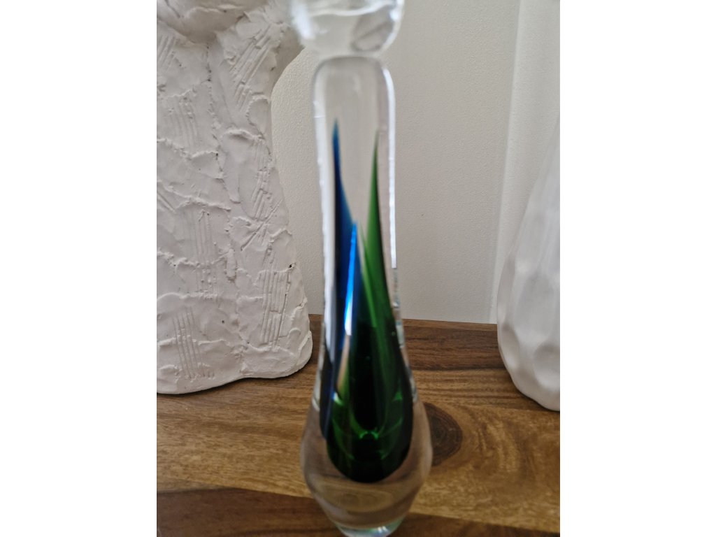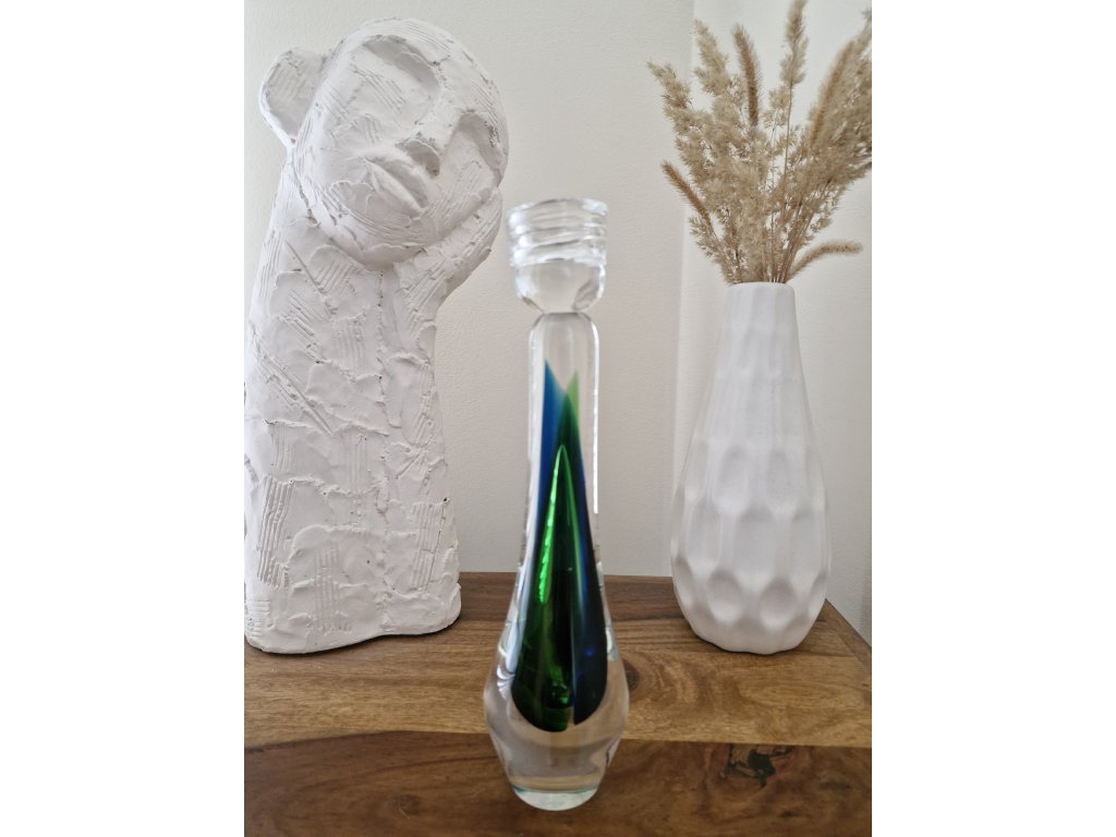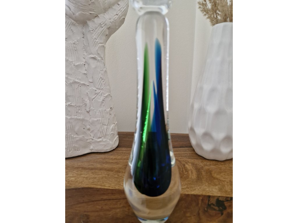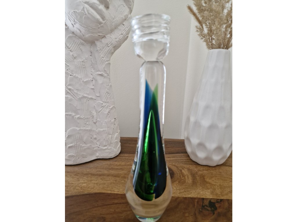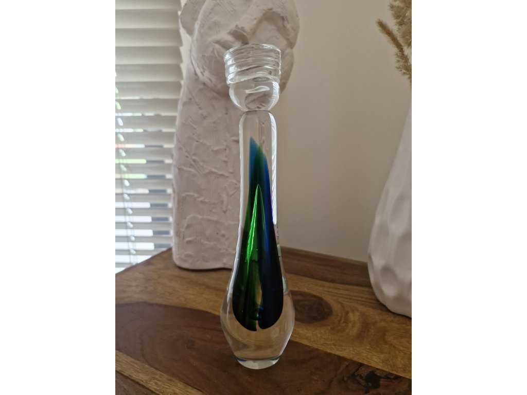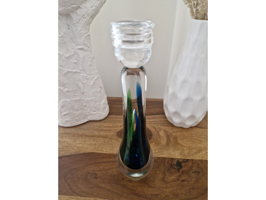 Luxusní svícen z hutního skla s krásným modro zeleným jádrem doplněným kapkou. Z produkce sklárny Art Glass PRINC, Žďár nad Sázavou, 2. pol. 20. století.Výška 25 cm. Top stav.