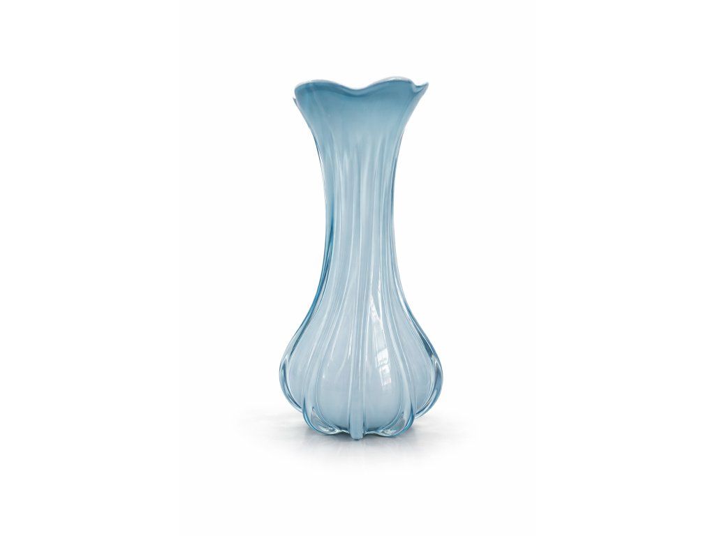 Nádherná vysoká tyrkysová váza z hutního skla s efektním opalovým jádrem z produkce sklárny Egermann Nový Bor, 90. léta 20. století. Výška 40 cm. S původní nálepkou sklárny a značením na podstavě. Top stav nového zboží.