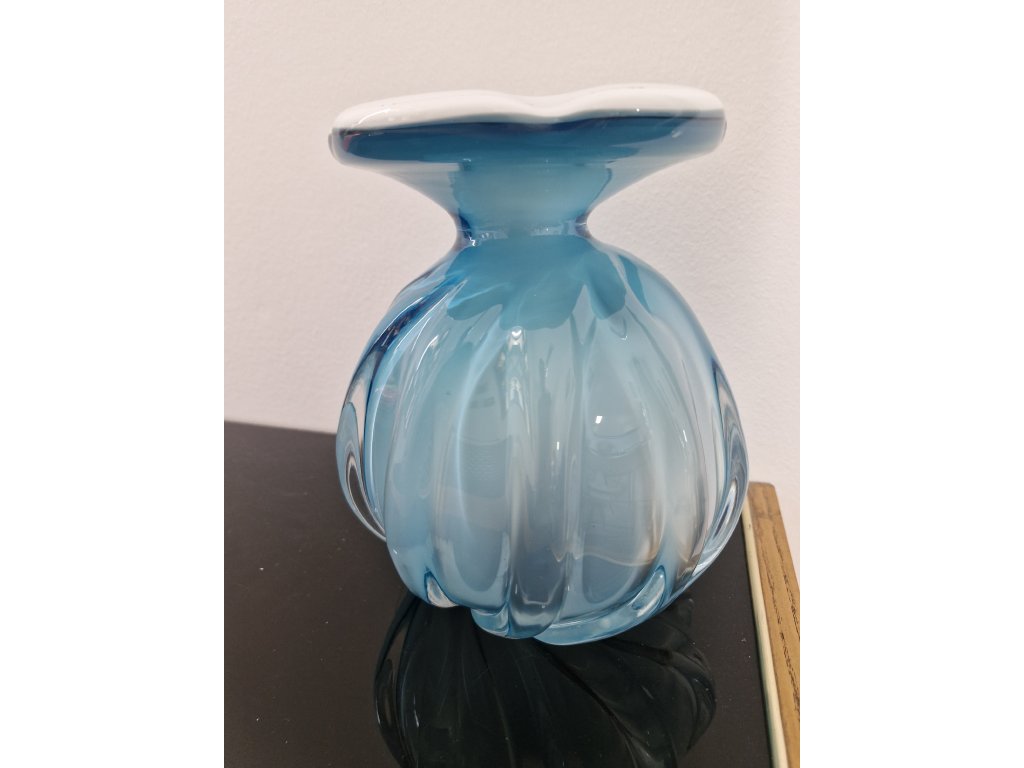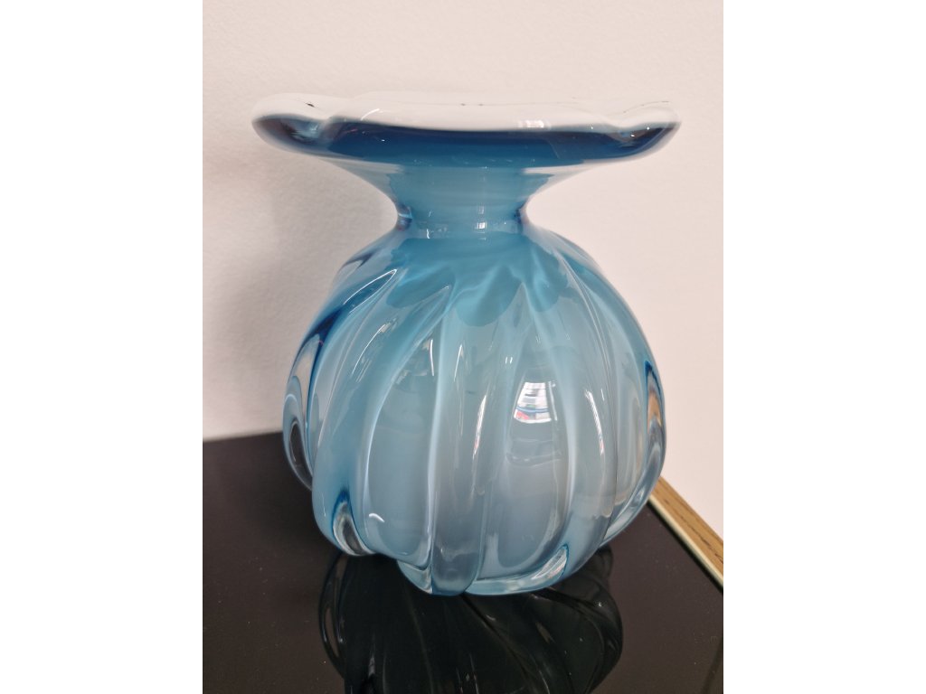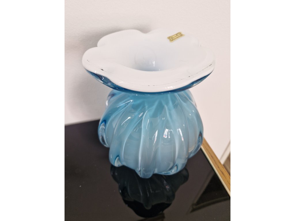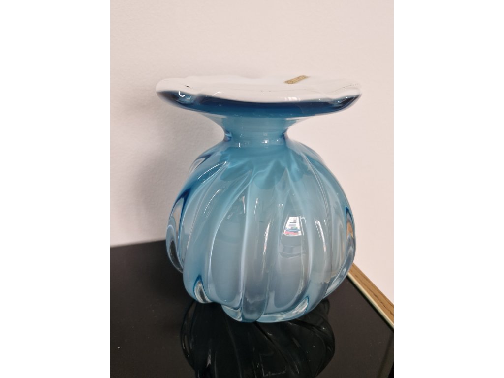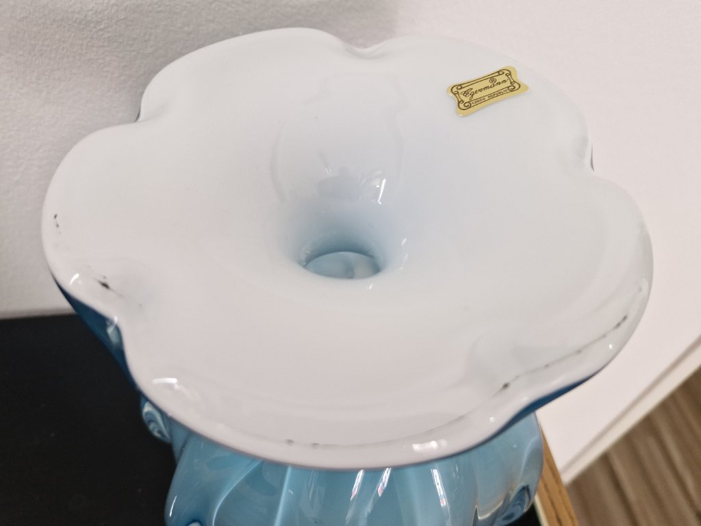 Nádherná tyrkysová váza z hutního skla s efektním opalovým jádrem z produkce sklárny Egermann Nový Bor, 90. léta 20. století. Výška 20,5 cm. S původní nálepkou sklárny a značením na podstavě. Top stav nového zboží.