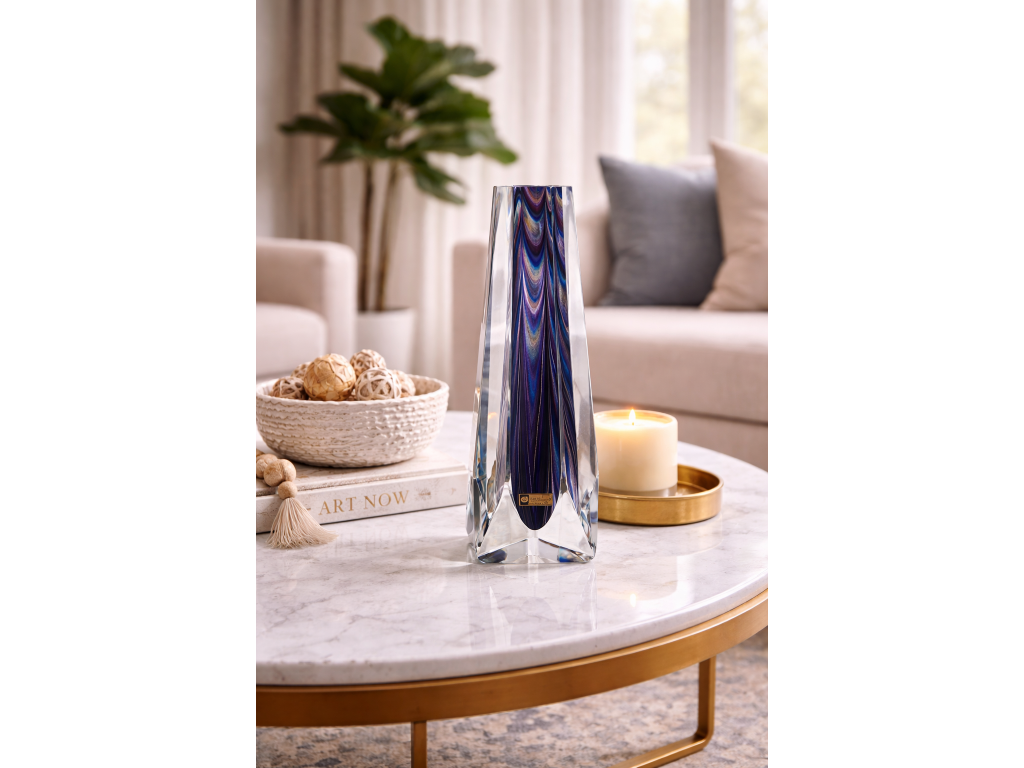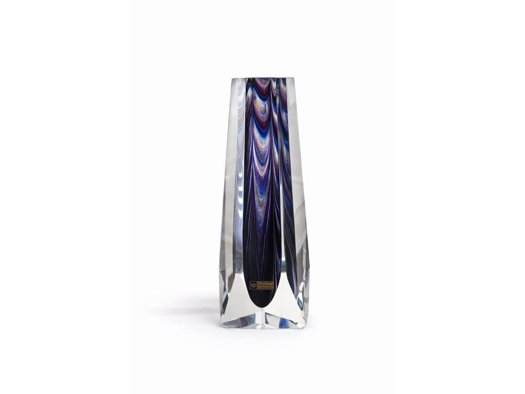 Nádherná váza "Kapka" s fialovým jádrem fazetově broušená, doplněným fosforovým prachem z produkce sklárny Crystalex Nový Bor, 70. léta 20. století. Výška 21 cm. TOP luxusní stav.
