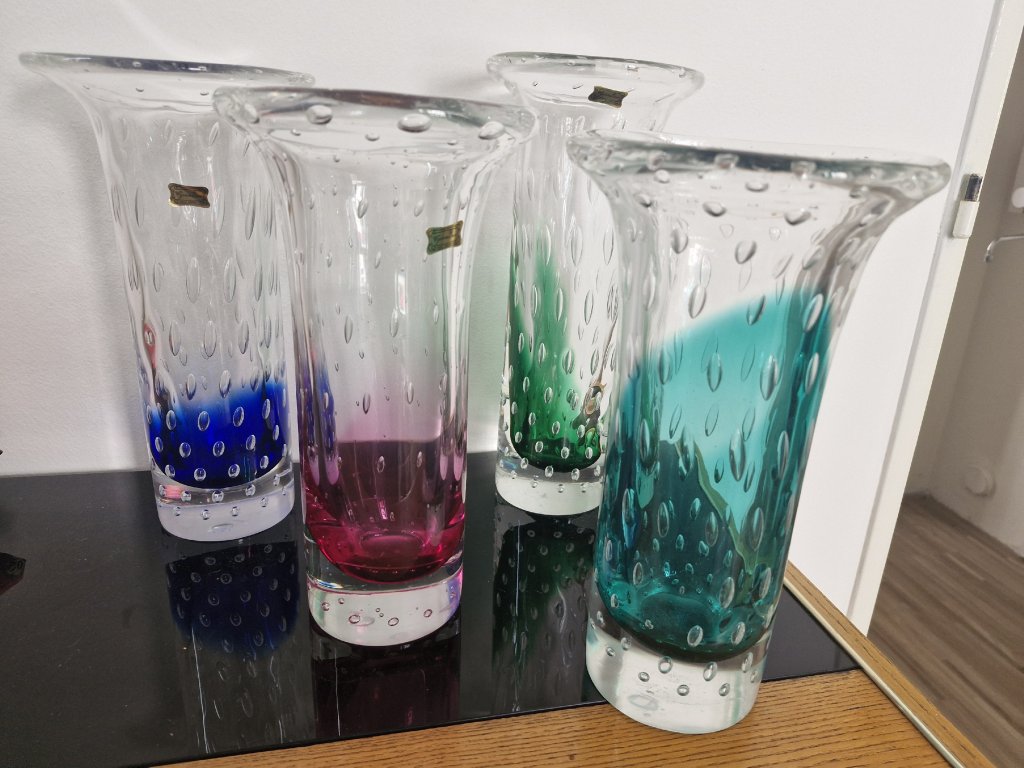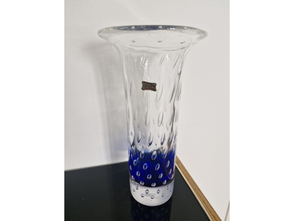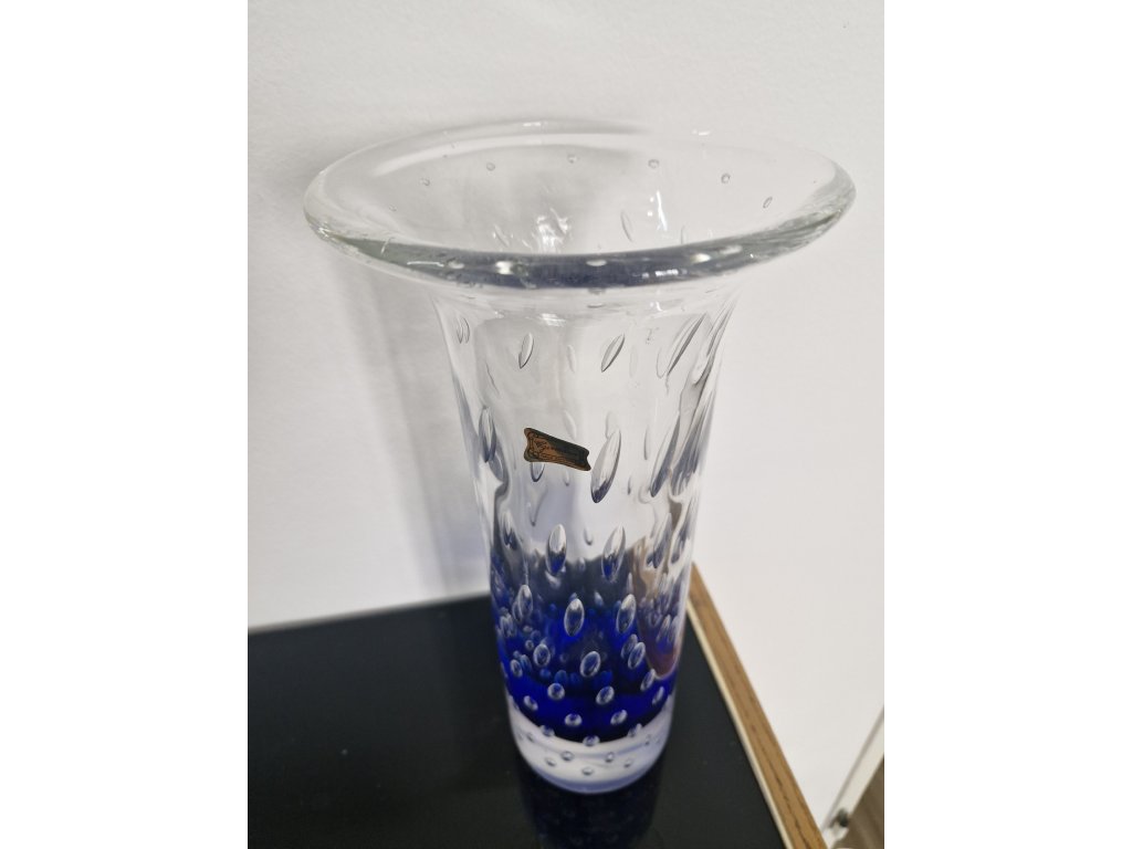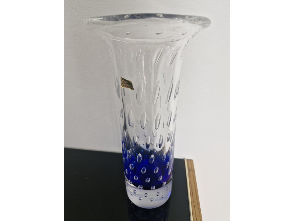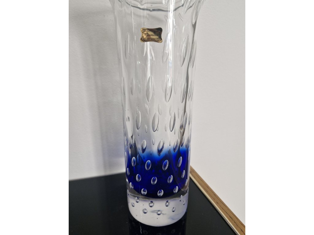 Nádherná masivní váza z hutního skla s dekorem řízených bublinek z produkce sklárny Egermann Nový Bor, 90. léta 20. století. Výška 31 cm. S původní nálepkou sklárny a značením na podstavě. Top stav nového zboží. Ideální na velké kytky.