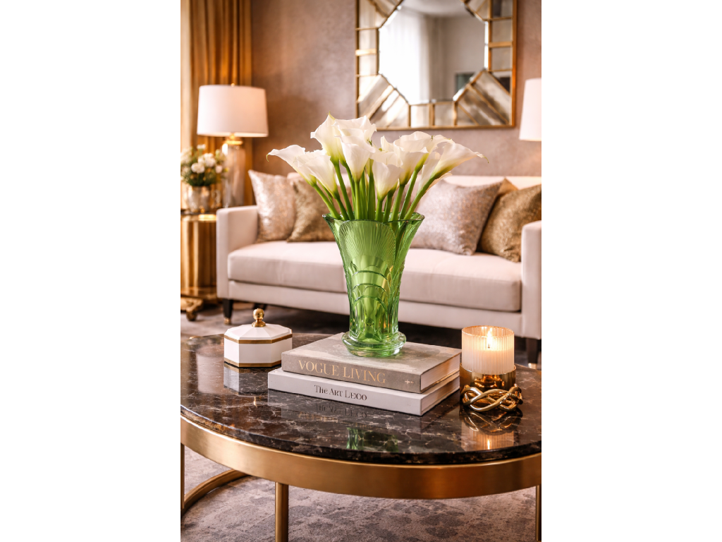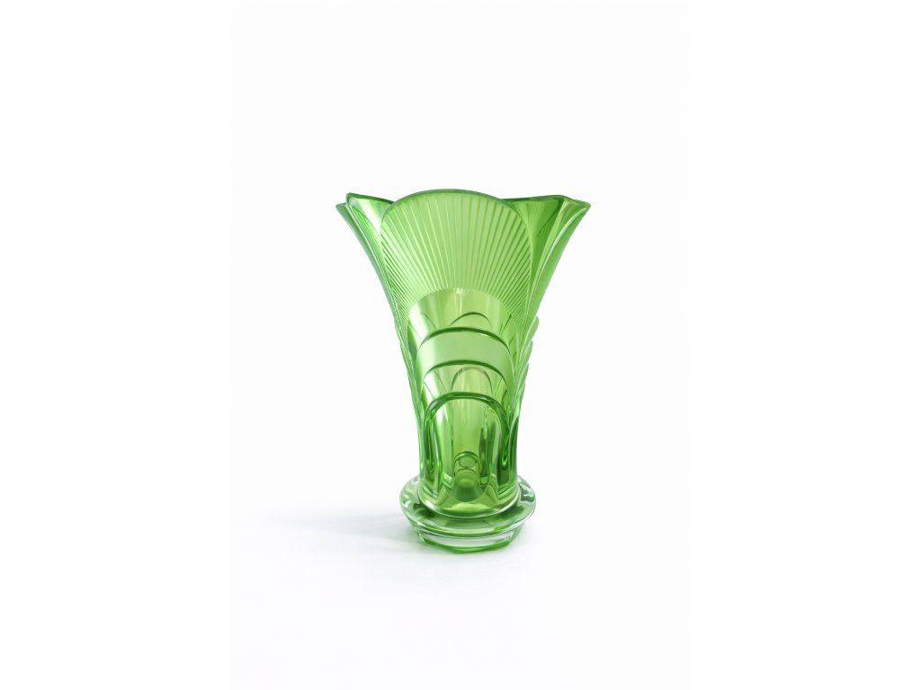Nádherná váza s celoplošně hluboce broušeným dekorem ve stylu Art Deco v krásné zelené barvě. Autorský návrh Rudolf Hloušek, sklárna Železný Brod, cca 30. - 40. léta 20. století. Výška 27 cm. Top stav.