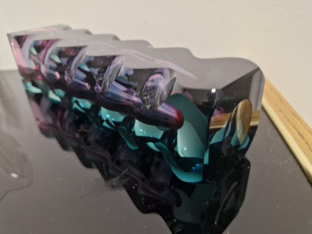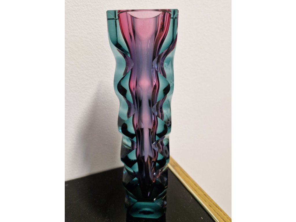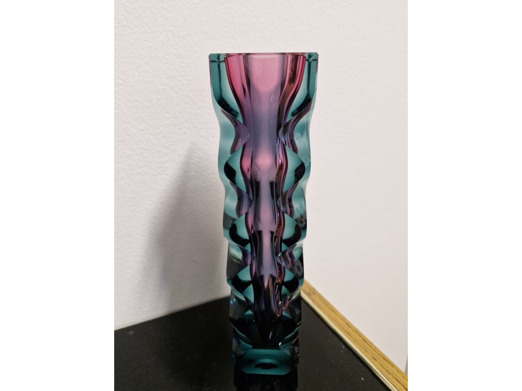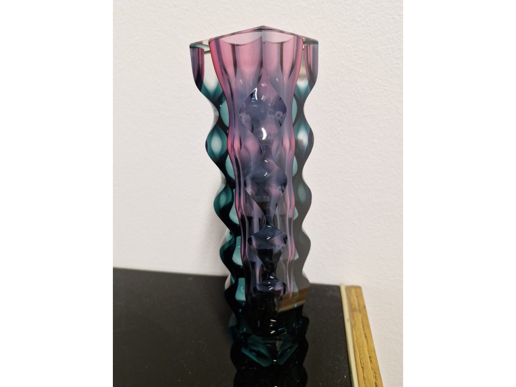 Luxusní váza z broušeného hutního skla v nádherné barevné kombinaci. Autorský návrh Oldřich Lipský, sklárna EXBOR, r. 1964. Výška 23 cm. Top sběratelský stav.
