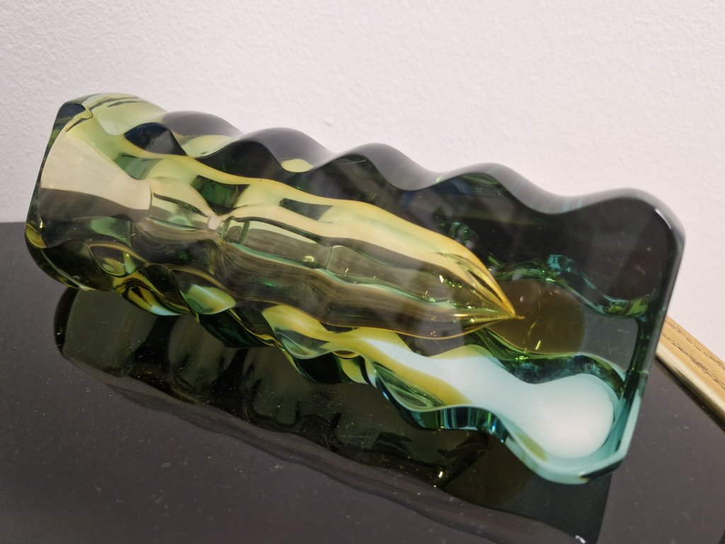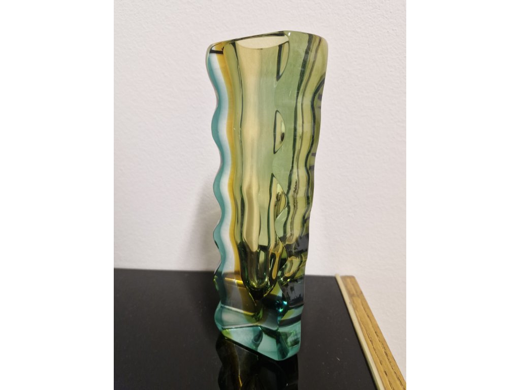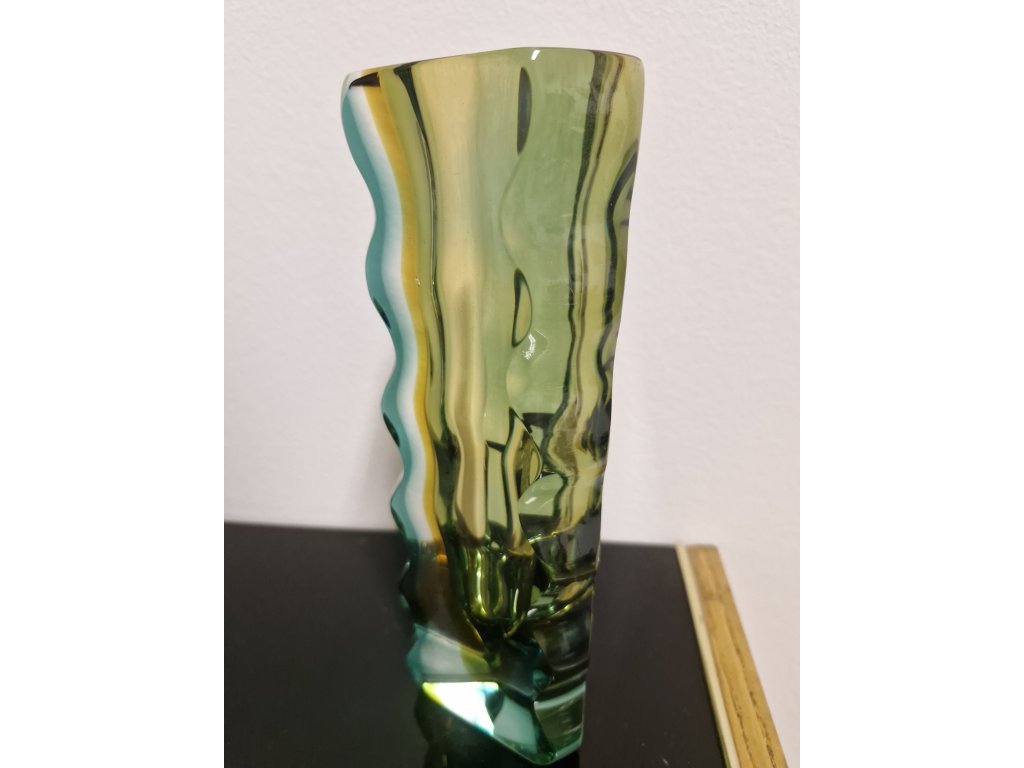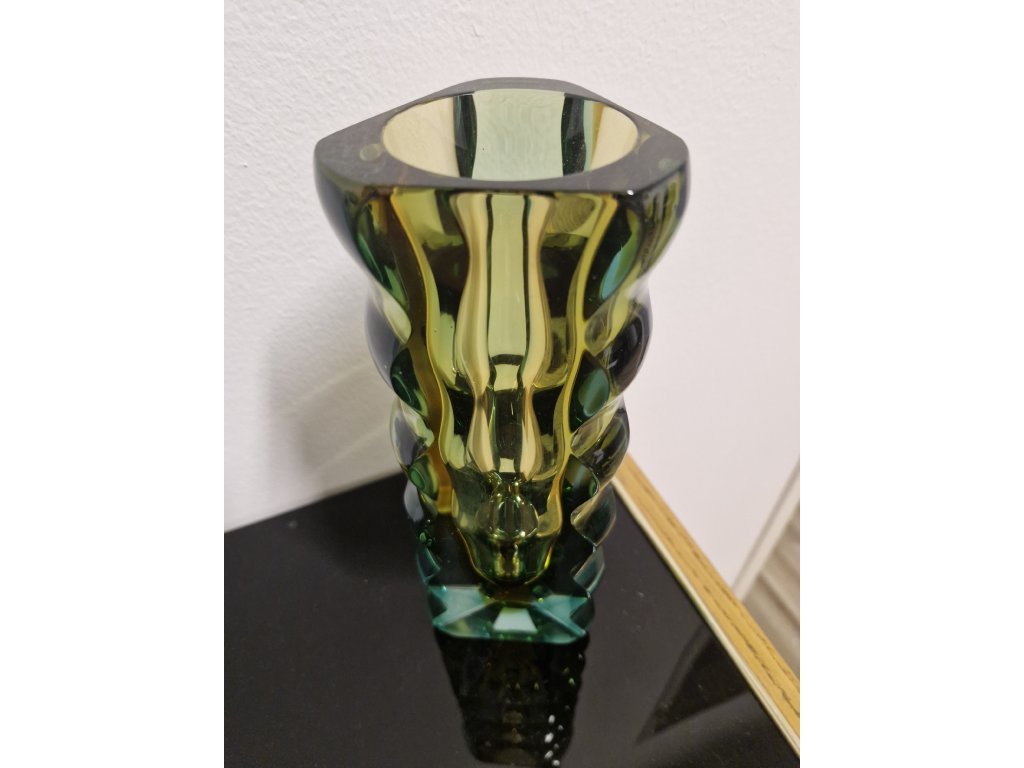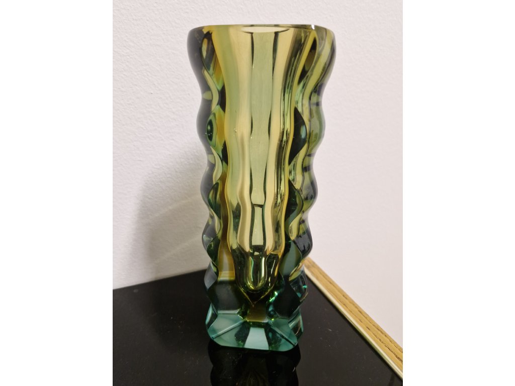 Luxusní váza z broušeného hutního skla v nádherné barevné kombinaci. Autorský návrh Oldřich Lipský, sklárna EXBOR, r. 1964. Výška 21 cm. Top sběratelský stav.
