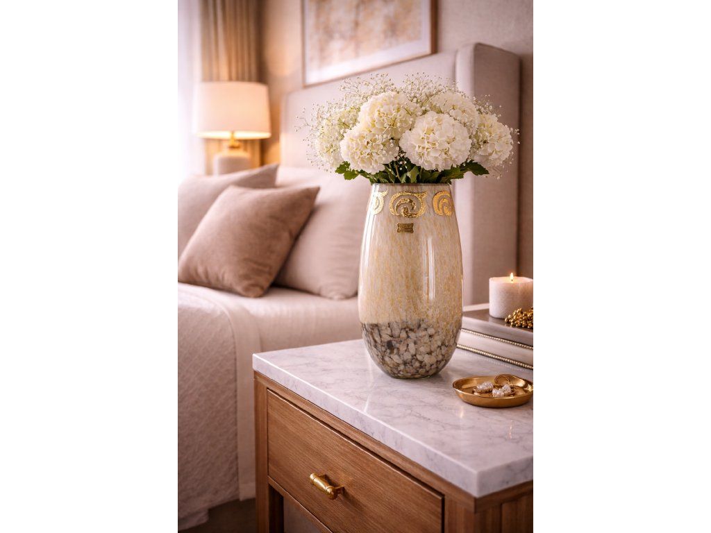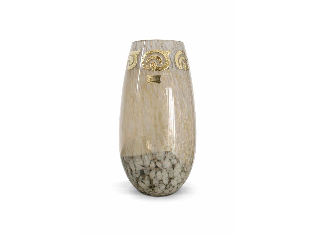 Nádherná váza z foukaného skla s ručně malovaným zlatým ornamentem pod horním okrajem z produkce sklárny Egermann Nový Bor, 90. léta 20. století. Luxusní kombinace matné bílé, béžové a zlaté barvy. Výška 32 cm. S původní nálepkou sklárny. Top stav nového zboží.
