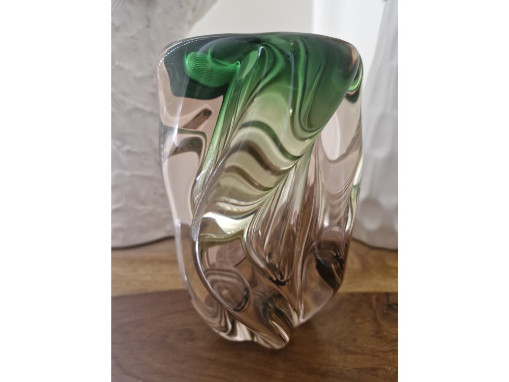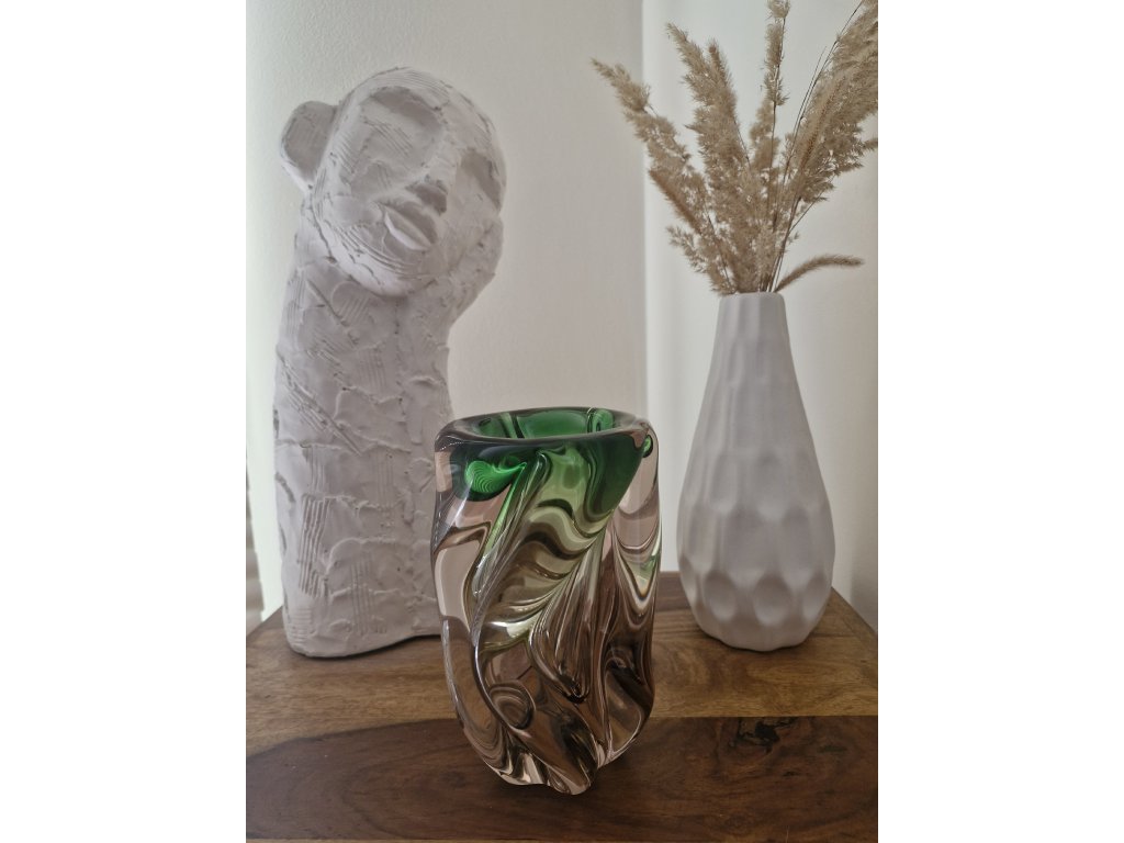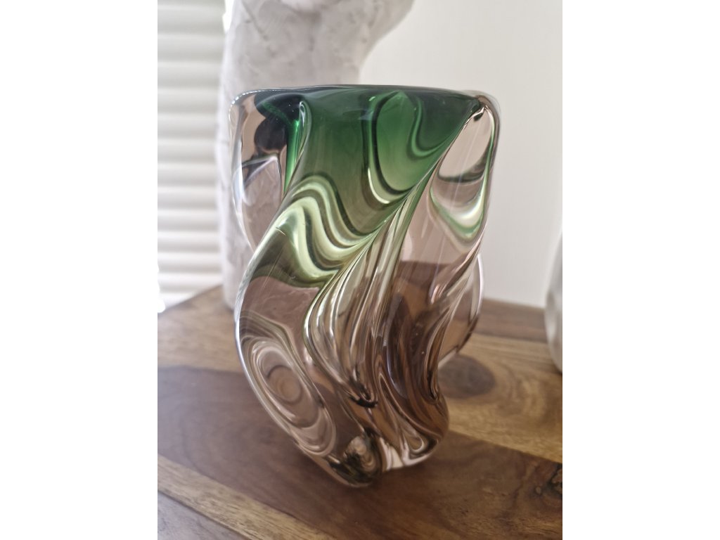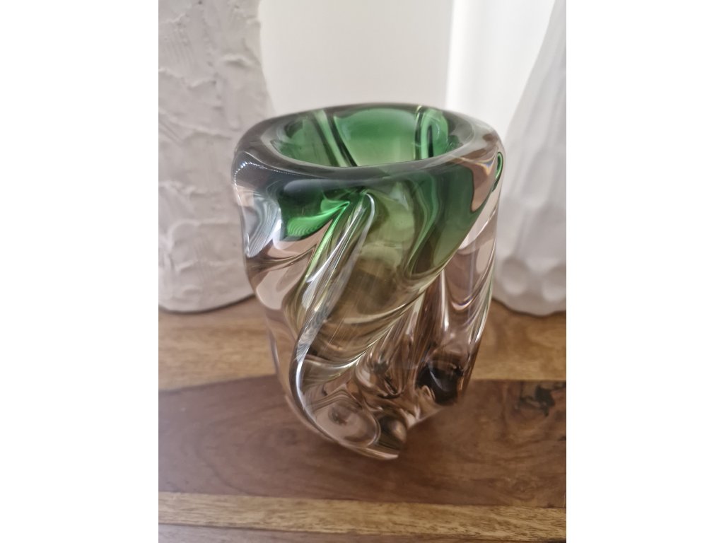 Nádherná váza z hutního skla v krásné fialovo - zelené barevné kombinaci dle autorského návrhu Josefa Hospodky, sklárna Chřibská, 60. léta 20. století. Výška 17 cm. Top sběratelský stav.