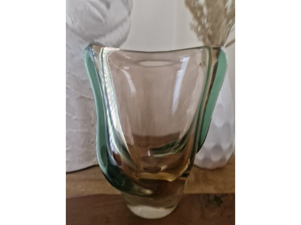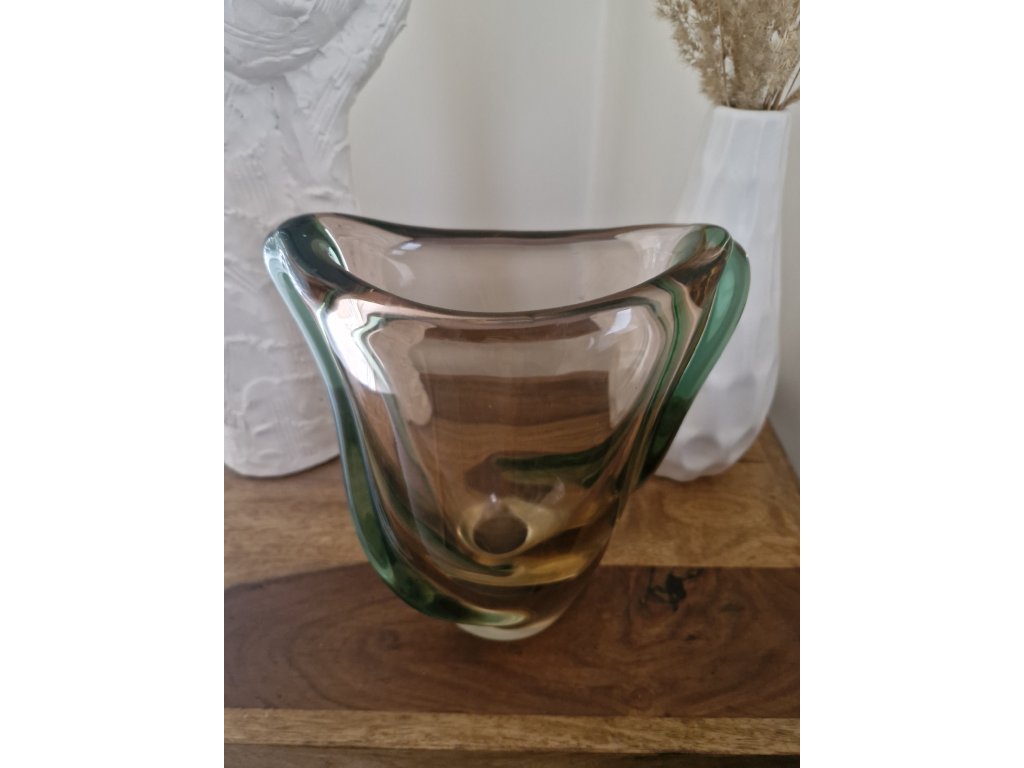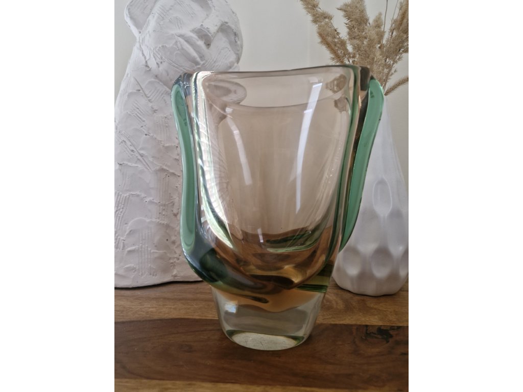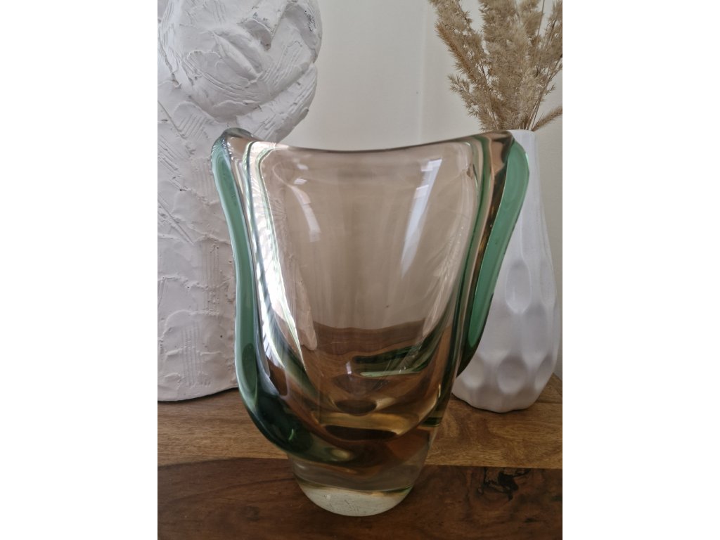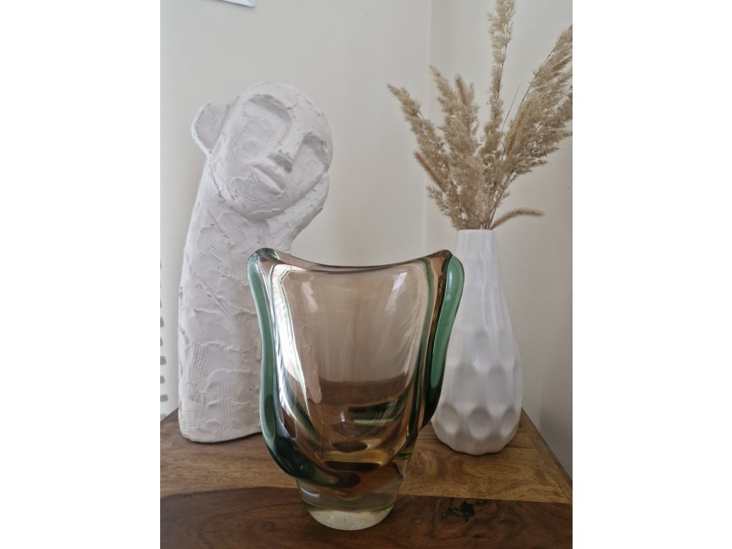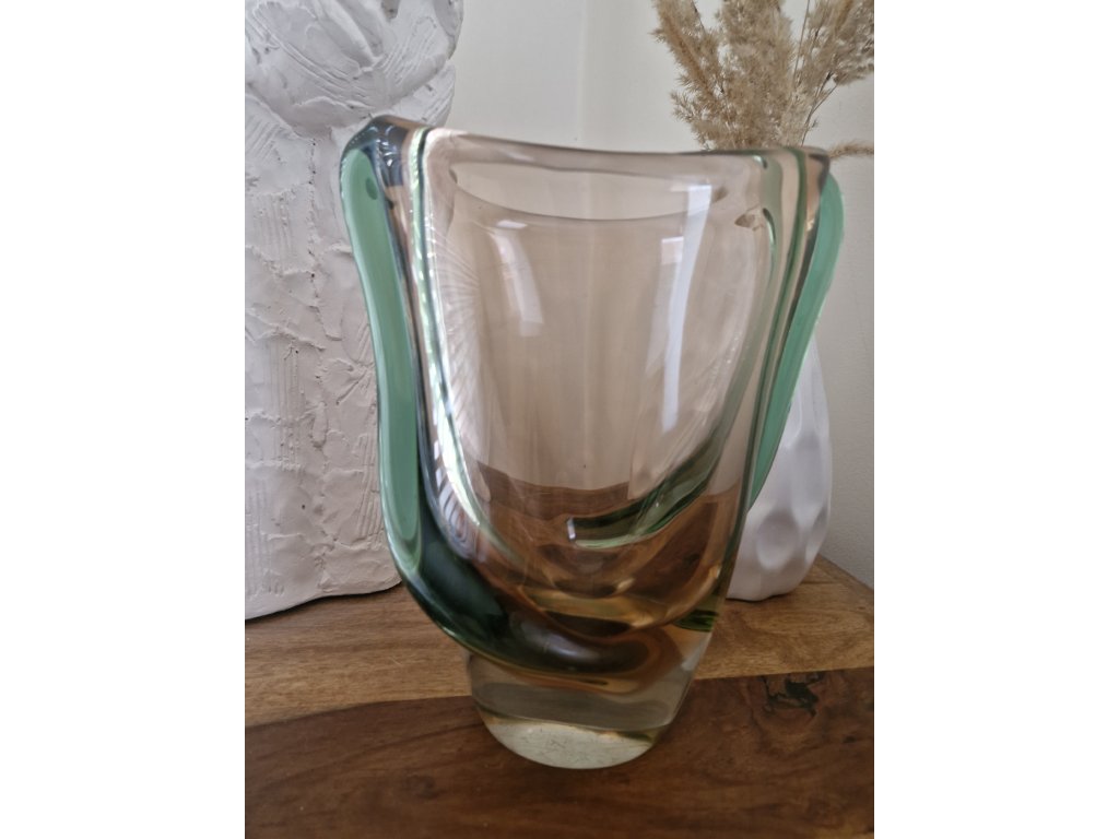 Luxusní masivní váza z hutního skla s nálepy dle autorského návrhu Emanuela Beránka, sklárna Škrdlovice, r. 1955. Výška 21 cm, horní šířka 18 cm. Top stav.