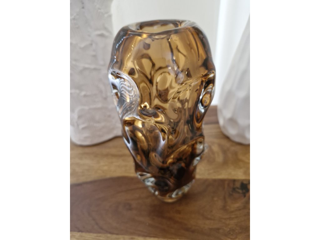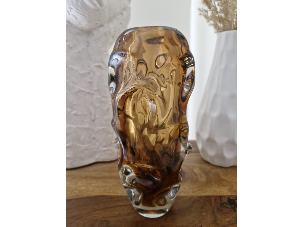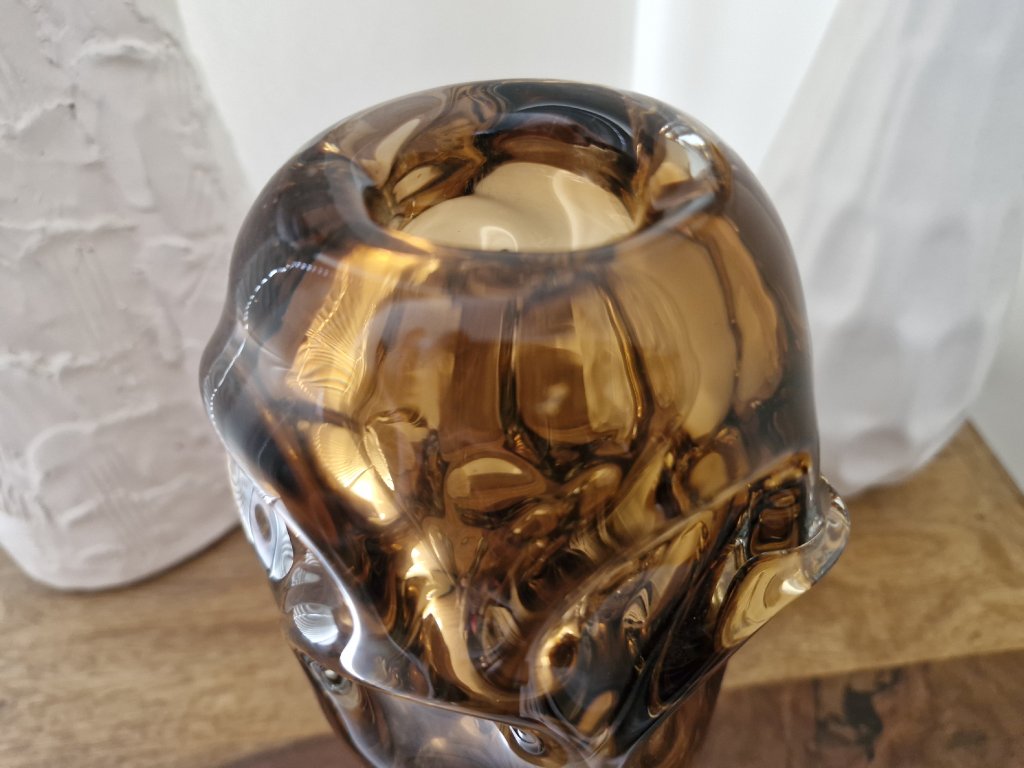 Nádherná váza z hutního skla dle autorského návrhu Jana Beránka, sklárna Škrdlovice, r. 1959. Výška 21 cm. Krásný stav, pouze v horní části (ne na hraně) jeden téměř neviditelný mikro oťuk.