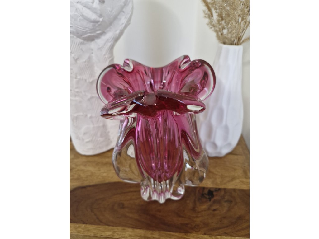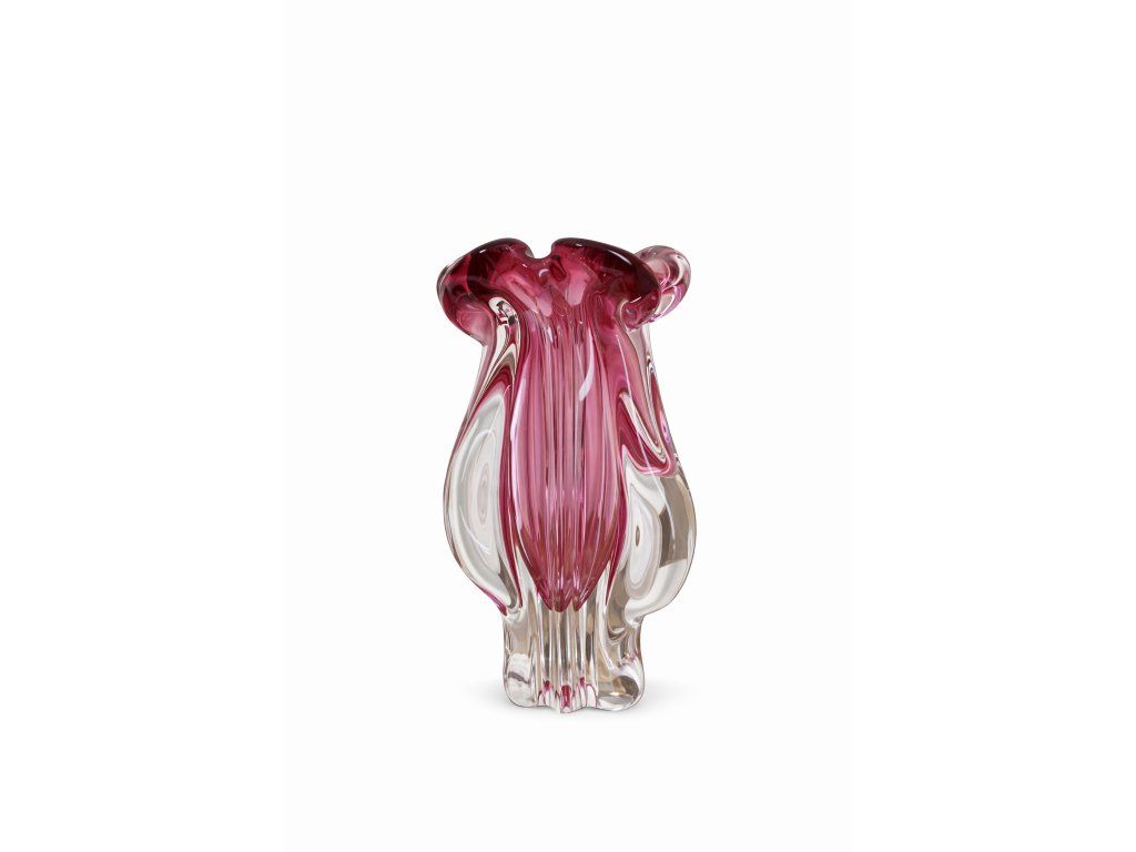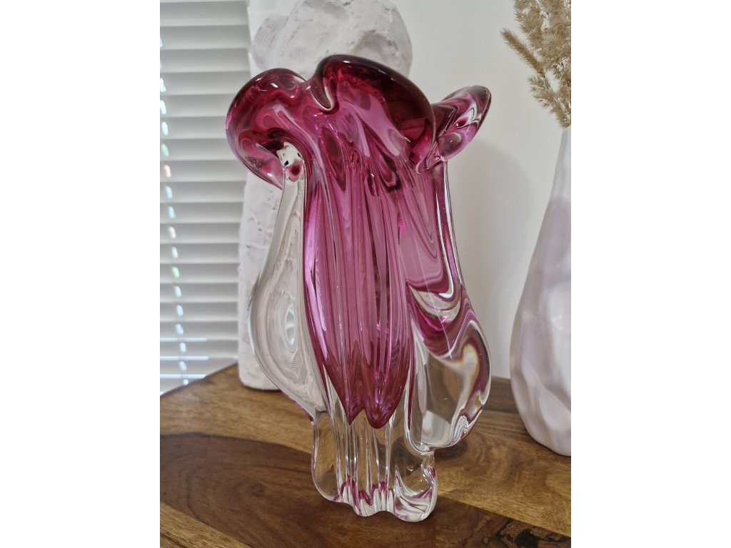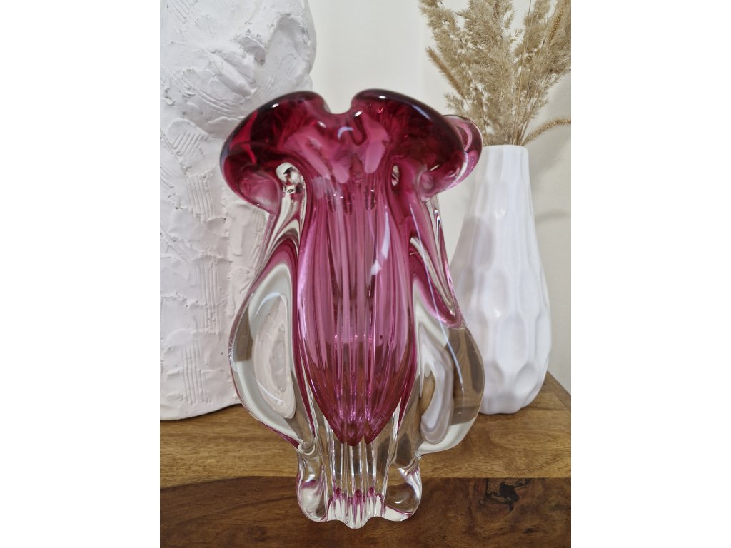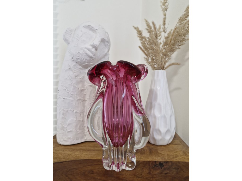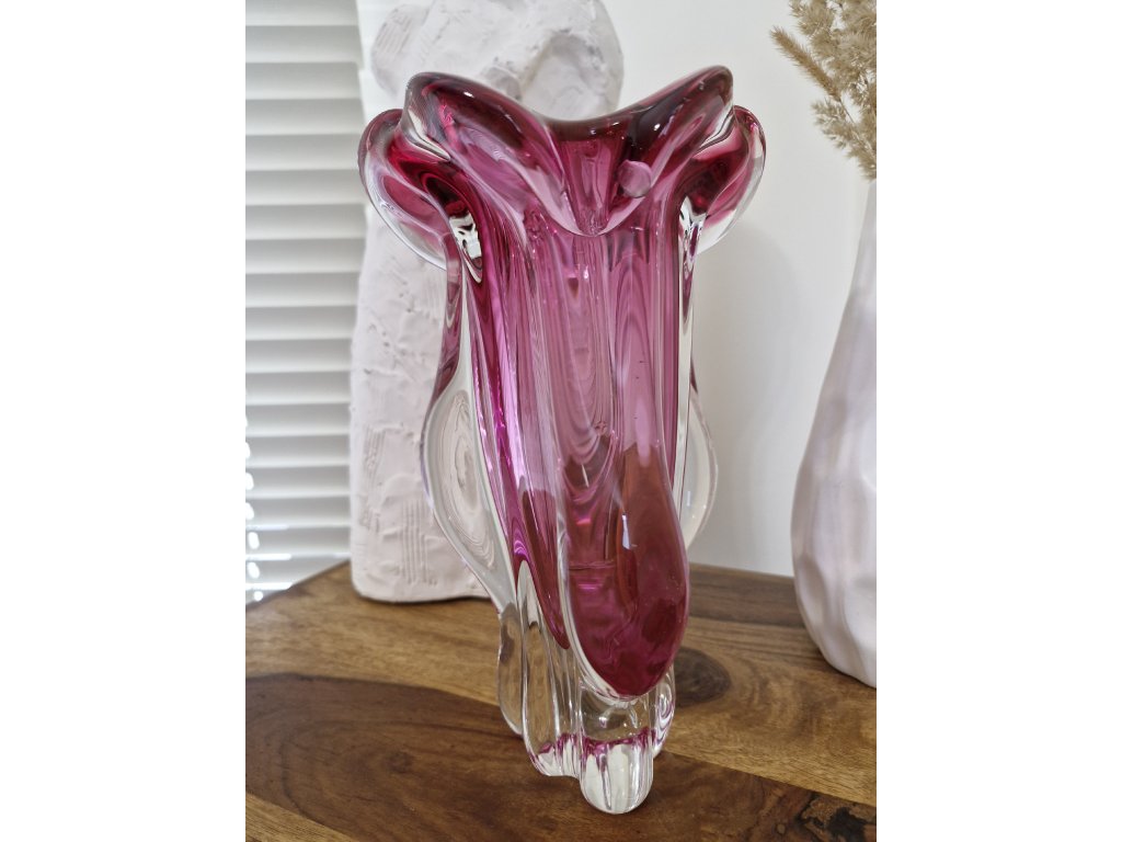 Nádherná masivní váza z hutního skla v méně vídané trojúhelníkové podstavě dle autorského návrhu Josefa Hospodky, sklárna Chřibská, 60. léta 20. století. Výška 24 cm. Top stav.