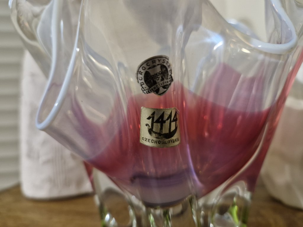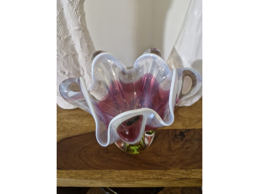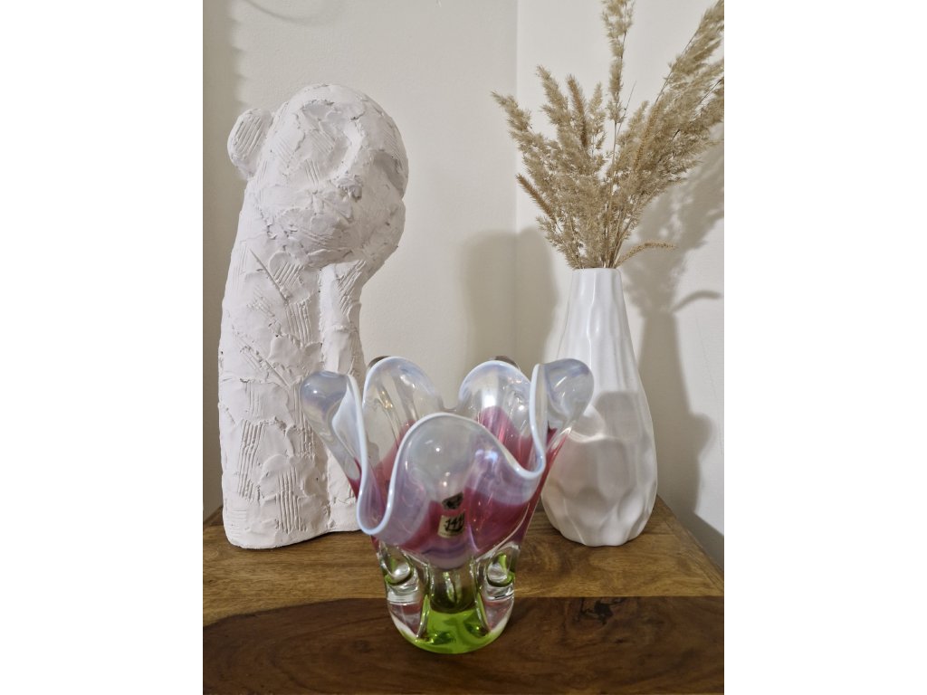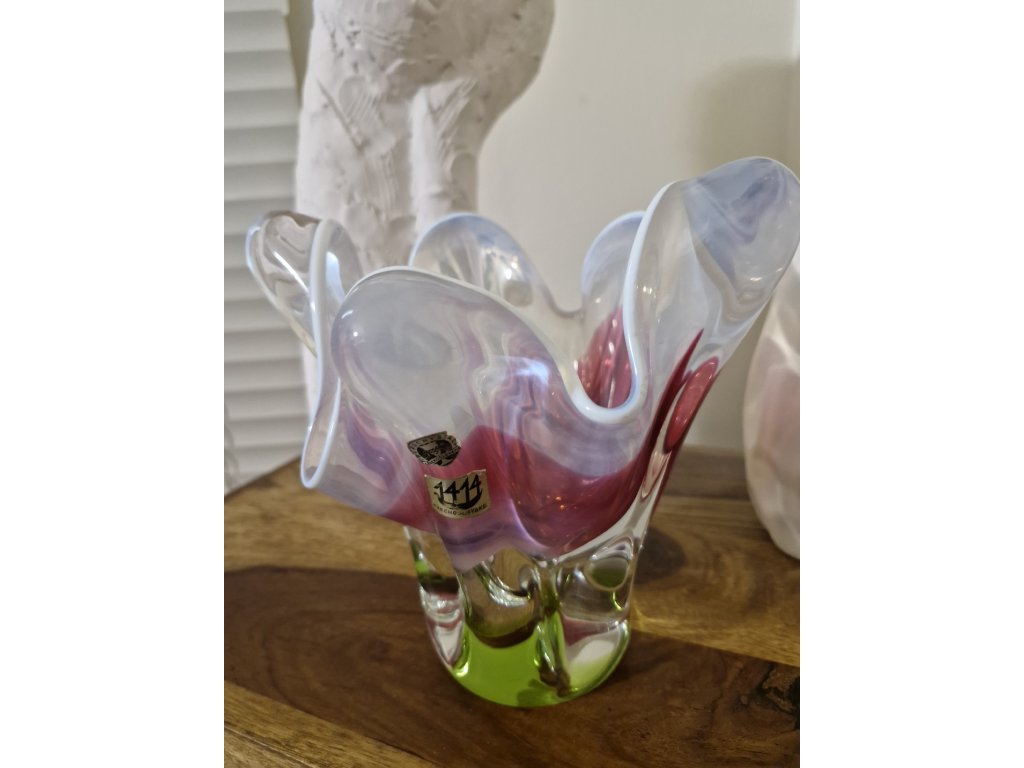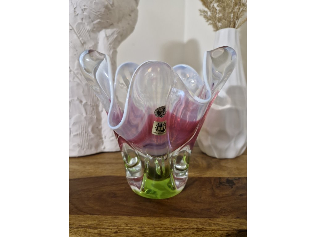 Krásná barevná váza z hutního skla (původně navržena jako miska na cukríky) dle autorského návrhu Josefa Hospodky, sklárna Chřibská, 60. léta 20. století. Výška 20 cm. Top stav. Se dvěma původními nálepkami v luxusním stavu.
