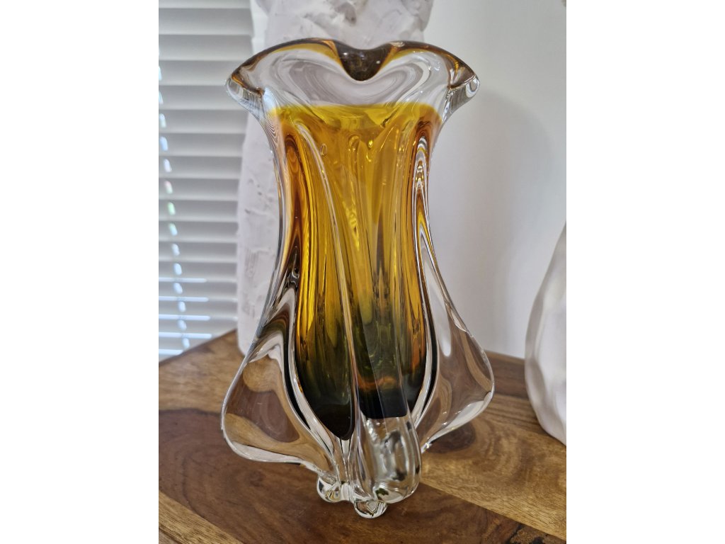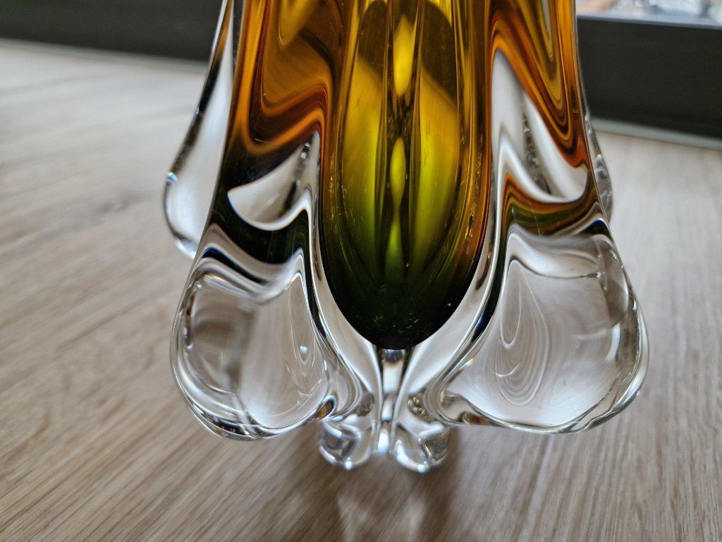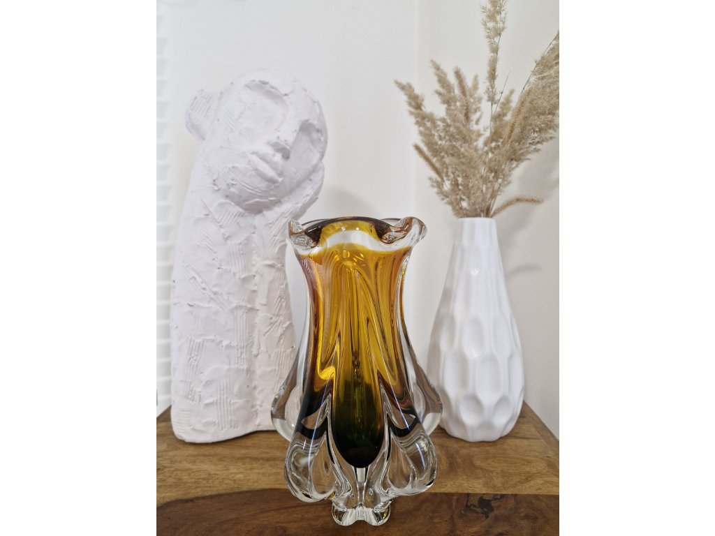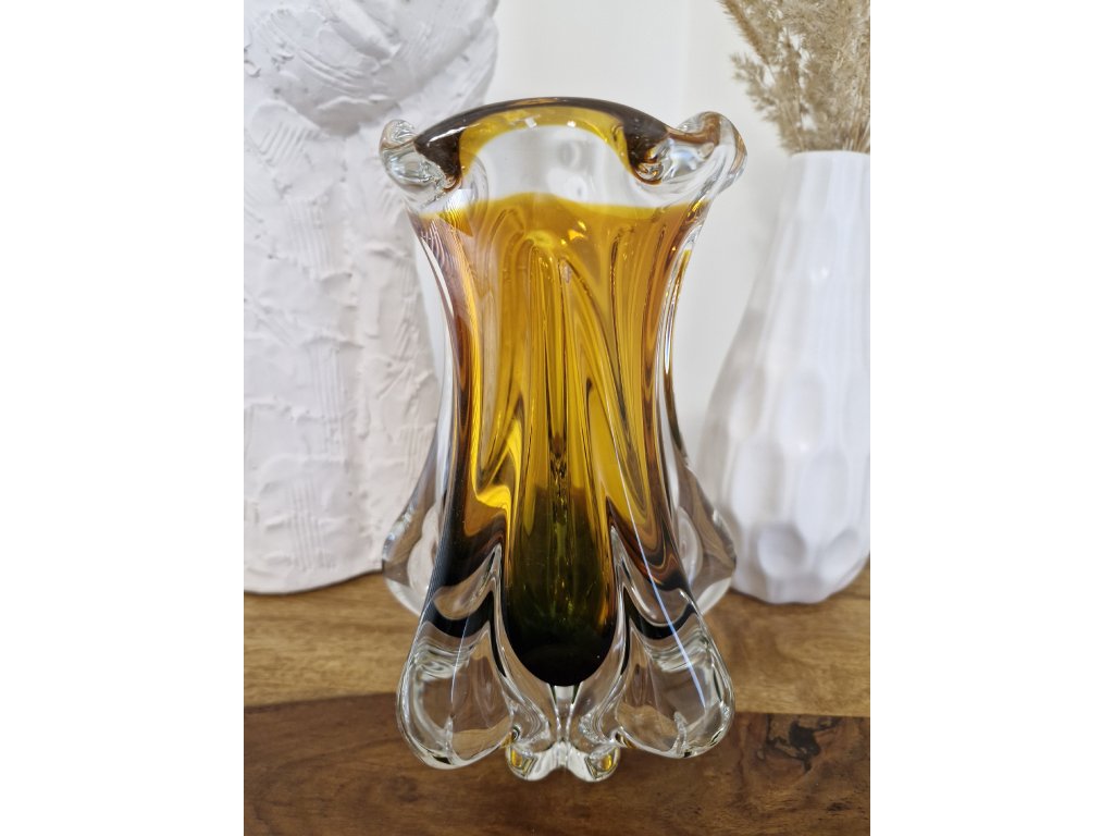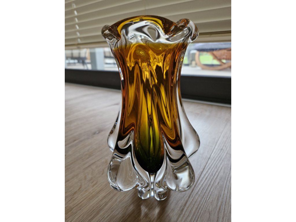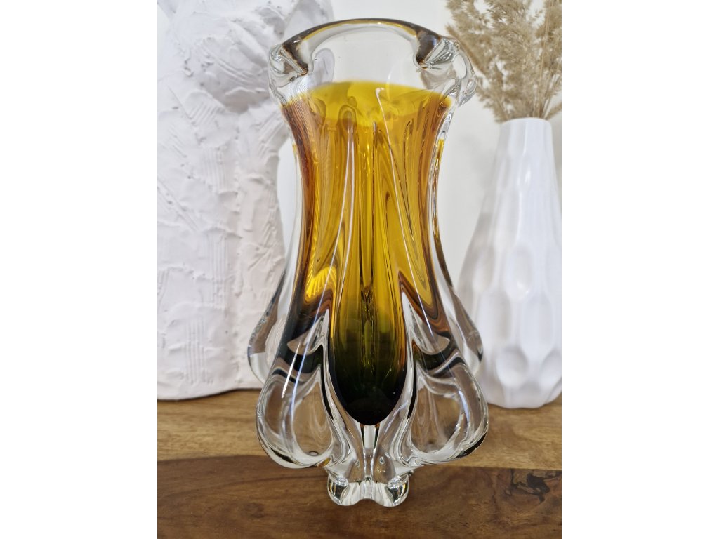 Nádherná váza z hutního skla v dokonalé žluto - smaragdové barevné kombinaci dle autorského návrhu Josefa Hospodky, sklárna Chřibská, 60. léta 20. století. Výška 24 cm. Top luxusní stav.