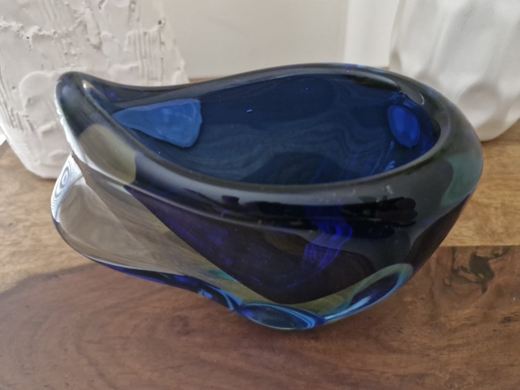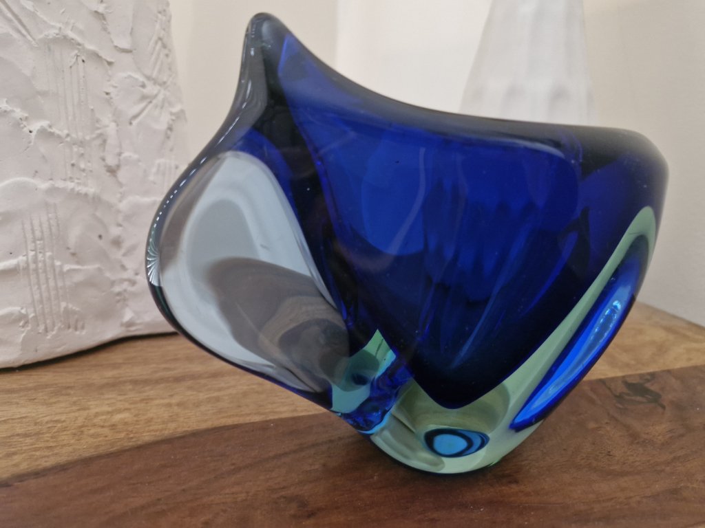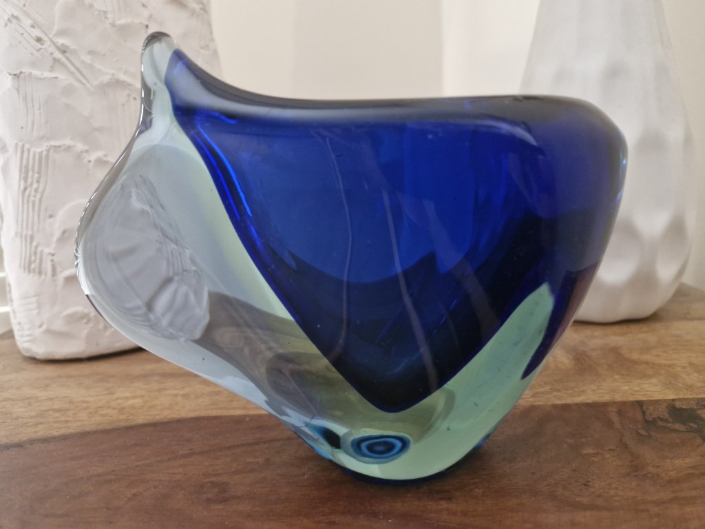 Překrásná váza z hutního skla dle autorského návrhu Márie Stáhlikové a MIleny Velíškové, sklárna Škrdlovice, r. 1960. Výška 14 cm. Top stav.