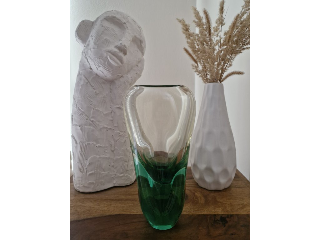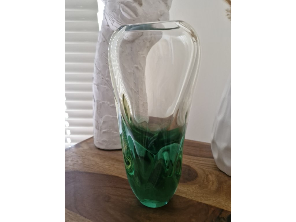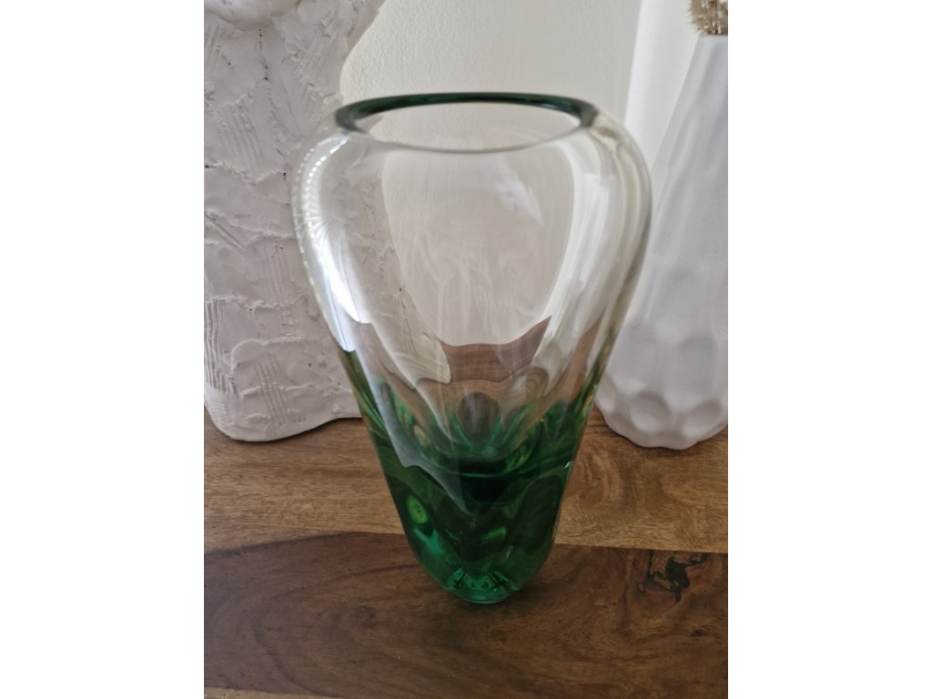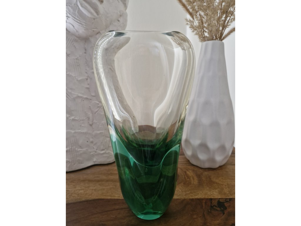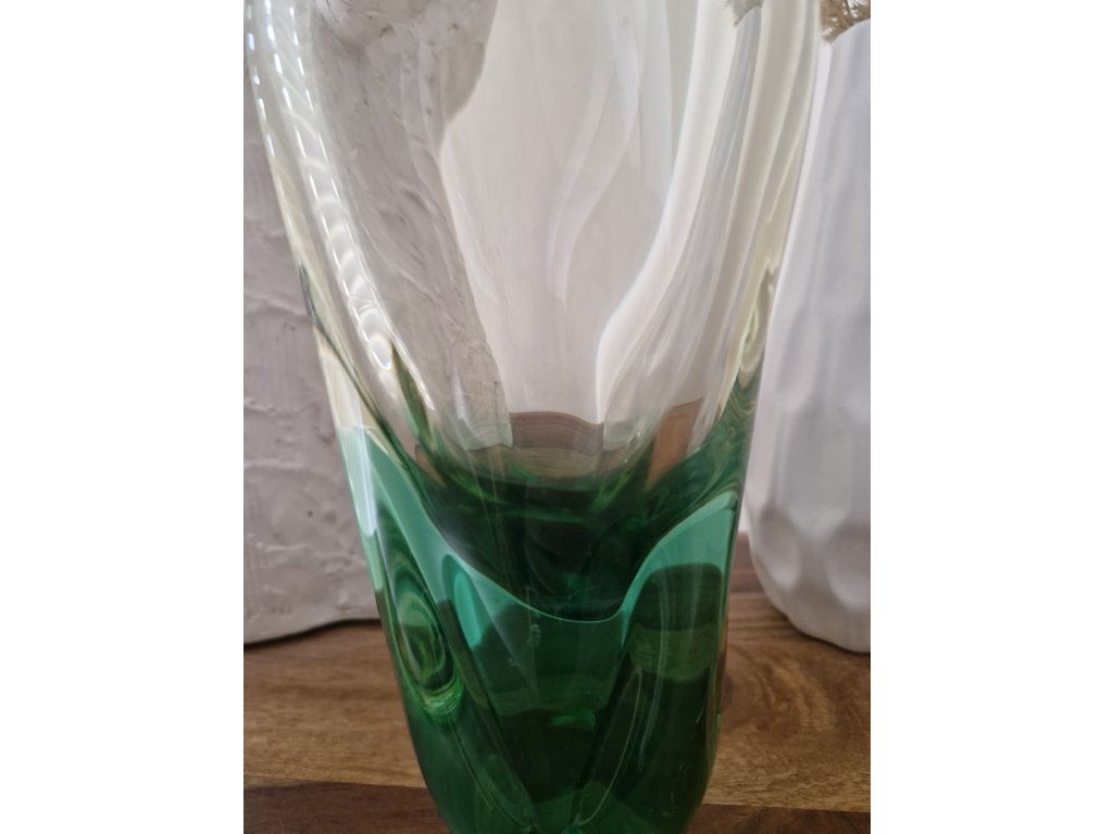 Nádherná váza z hutního skla v krásné kombinaci žluté a zelené skloviny dle autorského návrhu Miloslava Klingera, sklárna ŽBS, 60. léta 20. století. Výška 22 cm. Top stav.