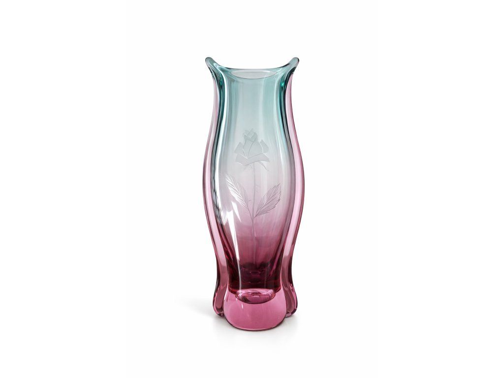 Překrásná váza z hutního skla s rytinou růže dle autorského návrhu Miloslava Klingera, sklárna ŽBS, 60. léta 20. století. Výška 27 cm. 100% TOP stav.