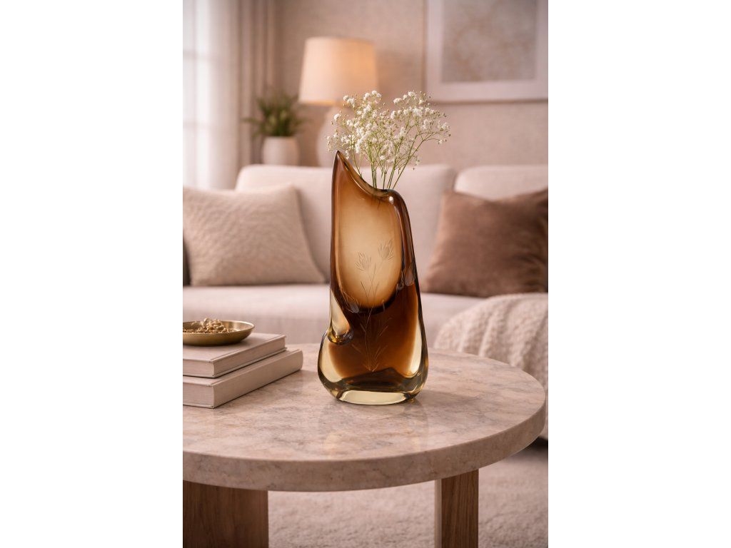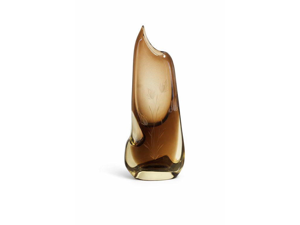 Nádherná váza z hutního skla s krásnou rytinou bodláků v kouřově - žluté barevné kombinaci dle autorského návrhu Josefa Cvrčka, sklárna ŽBS, 60. léta 20. století. Výška 39 cm. 100% TOP stav.