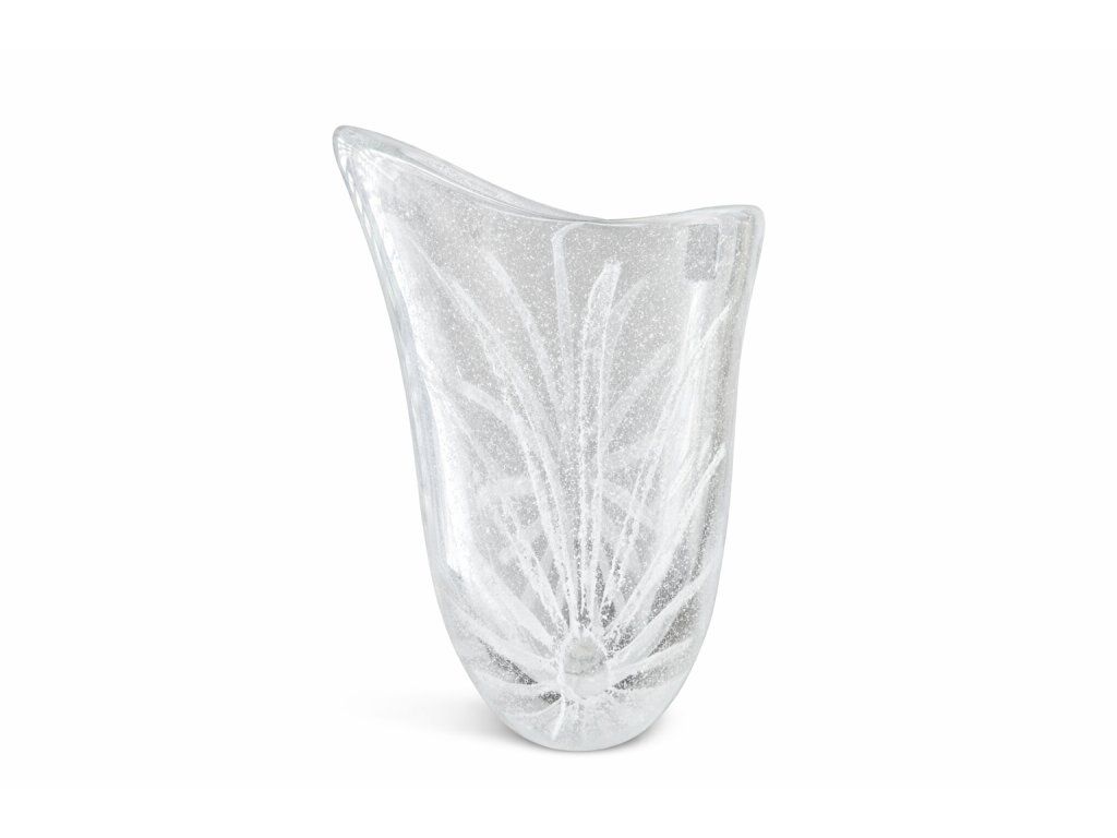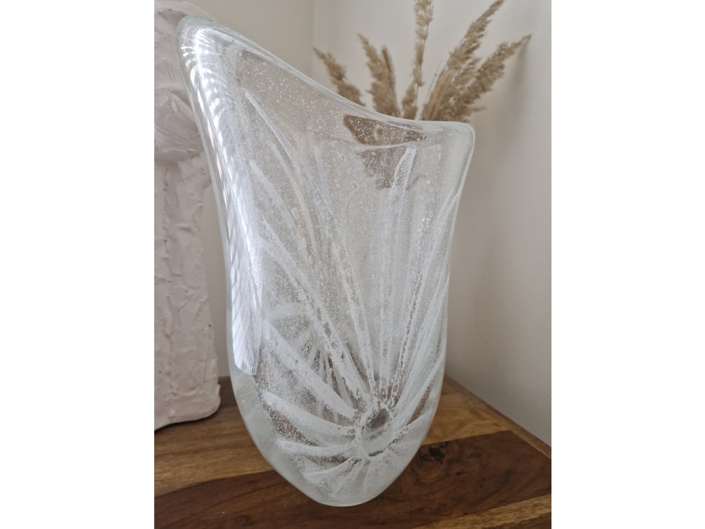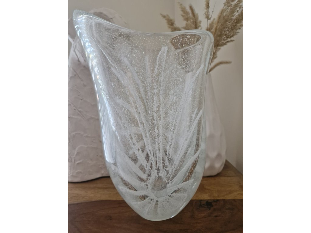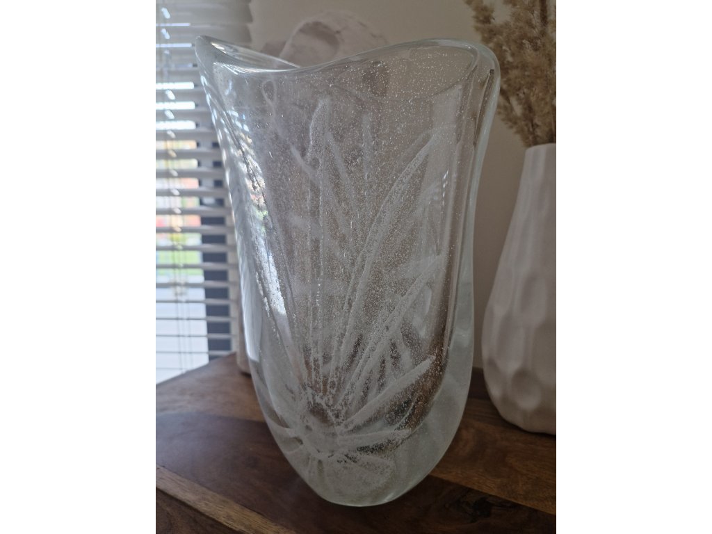 Nádherná masivní váza z čirého hutního skla s bílým dekorem připomínajícím sluneční paprsky. Z produkce sklárny Škrdlovice. Autorem návrhu je pravděpodobně Ladislav Paleček, ale nebylo možné jednoznačně určit dle vzorových knih. Výška 30 cm. Top sběratelský stav. V naší nabídce rovněž miska/popelník do sady.