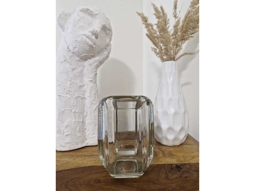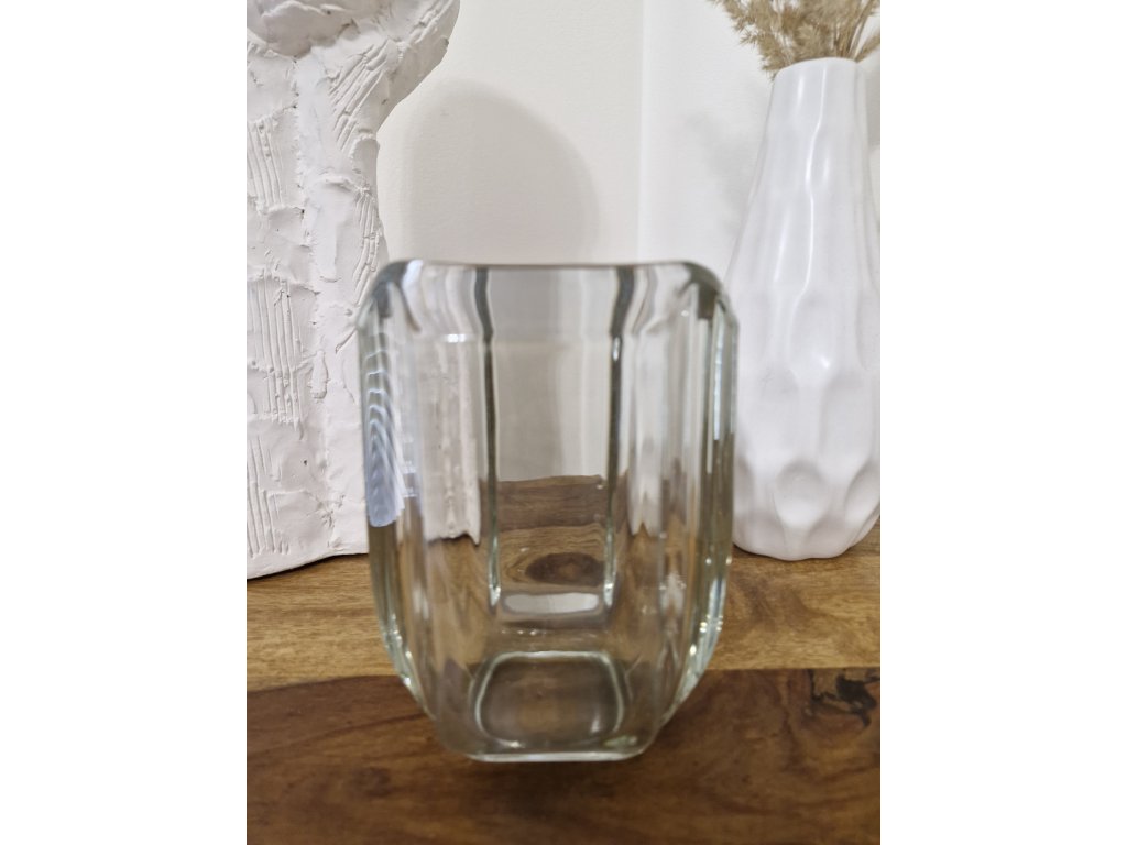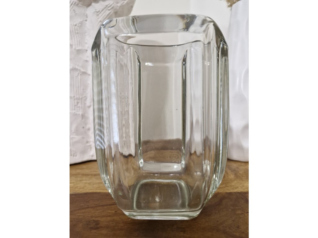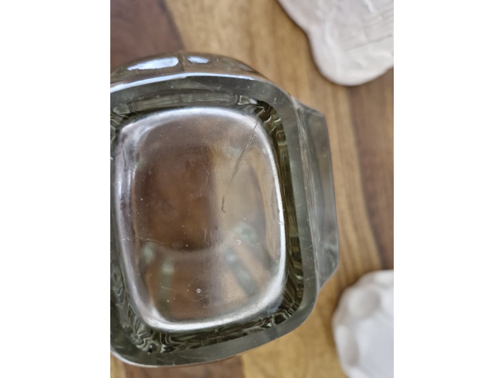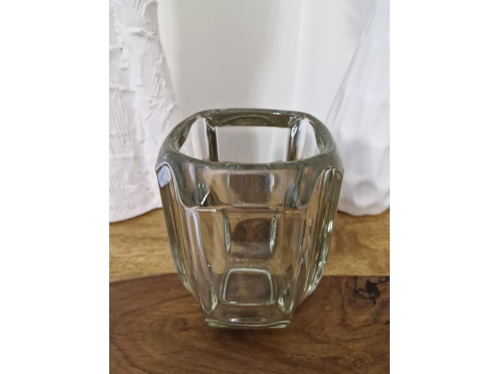 Nádherná masivní váza z lisovaného skla dle autorského návrhu laděny Víznerové, sklárna Rudolfova huť, r. 1968. Výška 15 cm. Top stav, pouze na podstavě jemná vlásečnice (je to v lisu, není to prasklé).