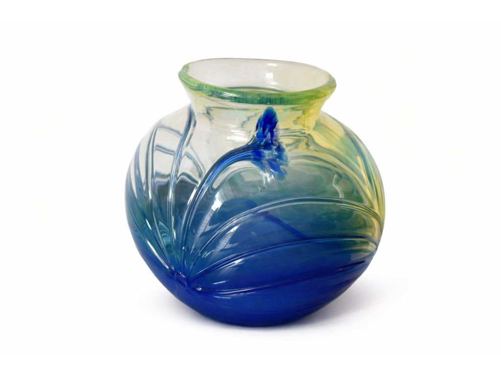 Nádherná váza z uranového foukaného skla s nálepy dle autorského návrhu Jiřího Šuhájka, sklárna Mstišov pro Moser, 70. léta 20. století. Výška 12 cm. 100% TOP stav.