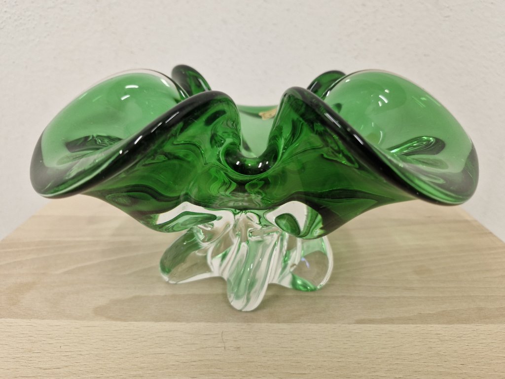 Nádherná mísa z hutního skla v krásné zelené barvě. Z produkce sklárny Egermann Nový Bor, 90. léta 20. století. Průměr 26 cm, výška 13 cm. S původní nálepkou sklárny. Top stav nového zboží.