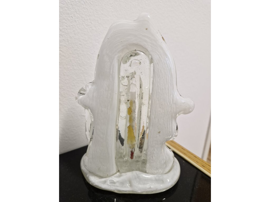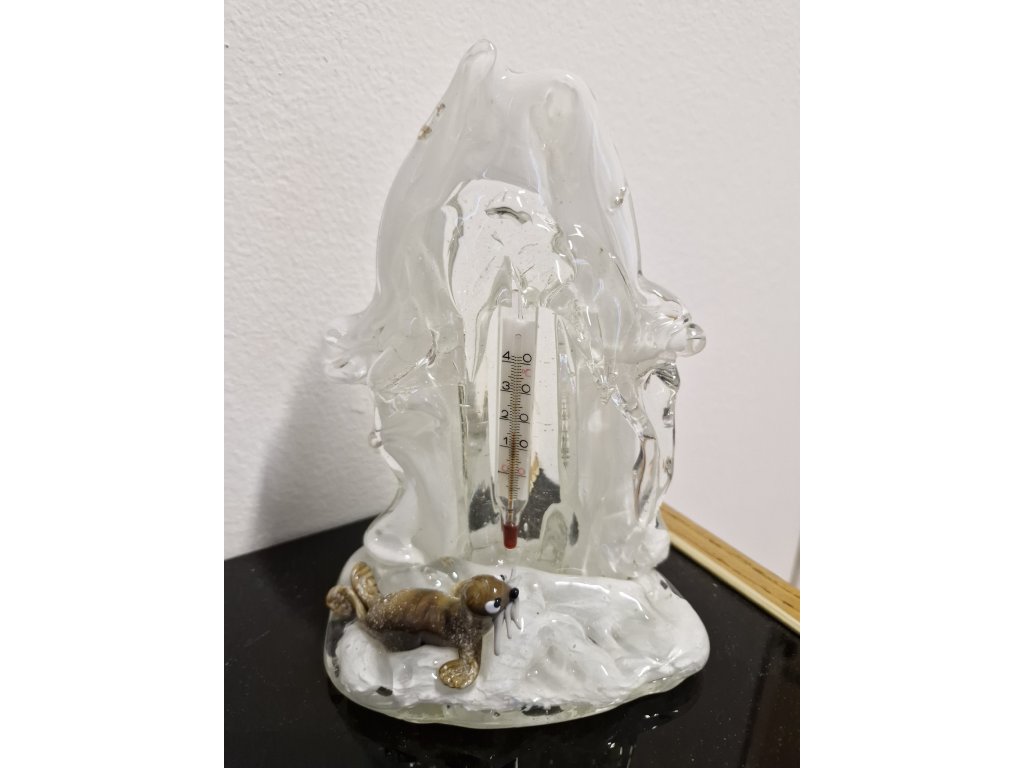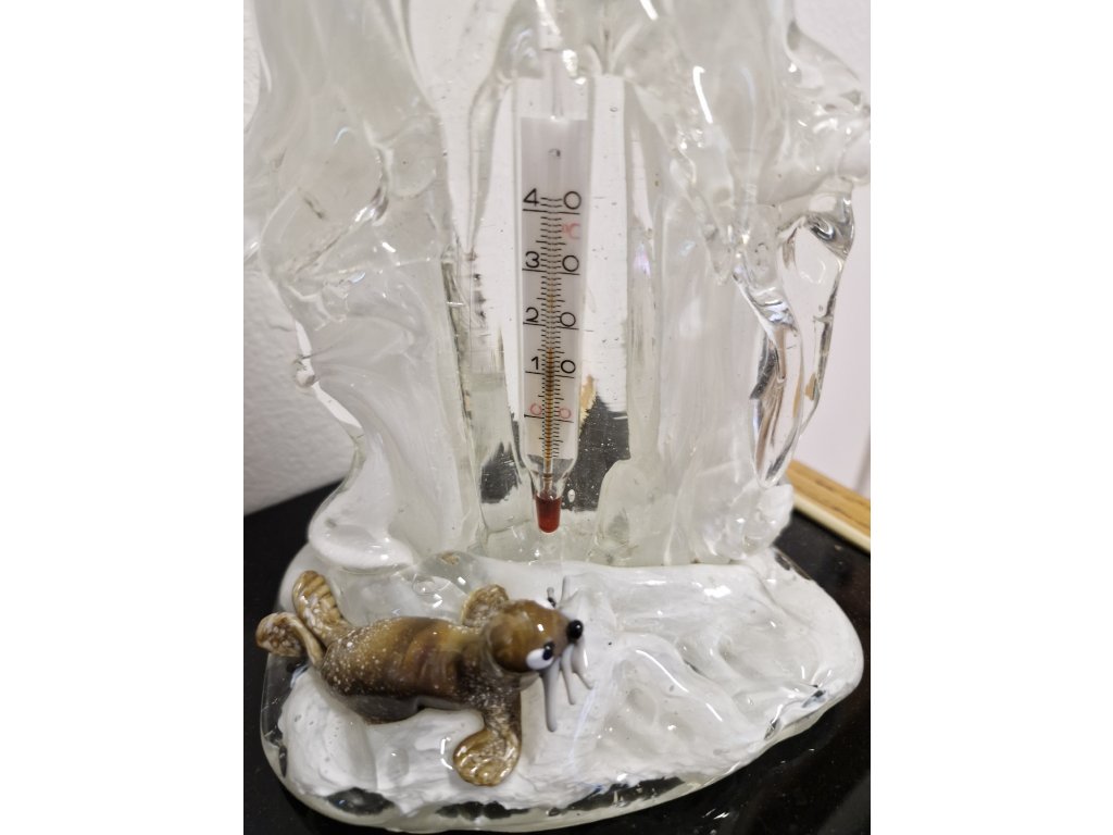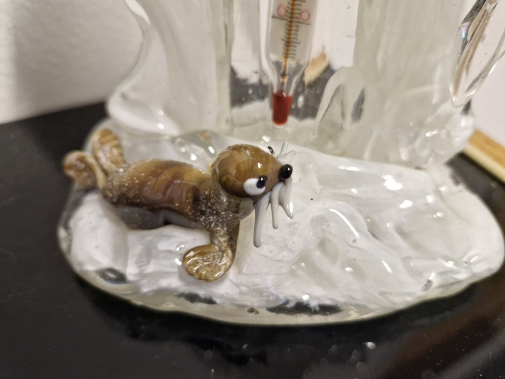 Nádherný skleněný teploměr dle původního návrhu Jaroslava Brychty, sklárna ŽBS. S motivem mrože. Výška 17 cm, šířka v nejširší části 15 cm. 100% TOP luxusní sběratelský stav.