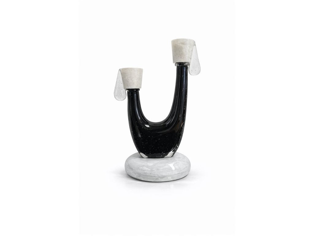 Krásný, málo vídaný svícen z hutního skla z produkce sklárny ŽBS, 60. léta 20. století. Výška 20 cm. Top stav. Na podstavě původní nálepka sklárny.
