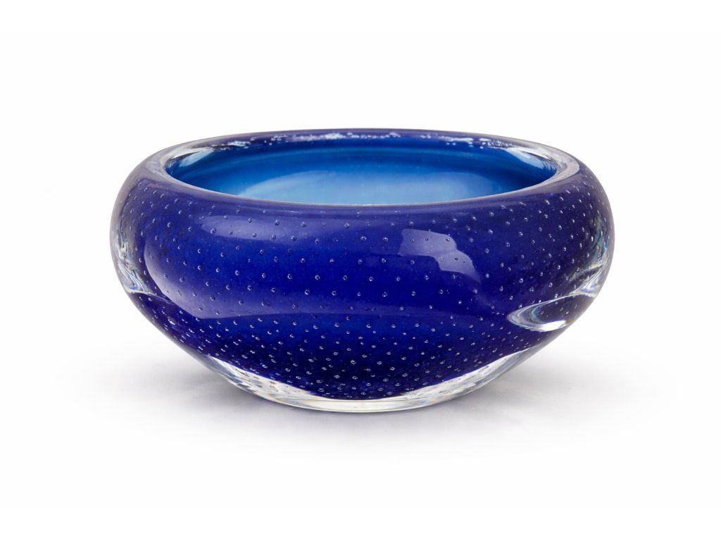Originální masivní mísa z foukaného skla s řízenými bublinkami. S krásným tyrkysovým vnitřkem. Autorské dílo Jiřího Vinklárka, sklárna Art Glass PRINC. Výška 11 cm, délka 20 cm. 100% TOP stav.