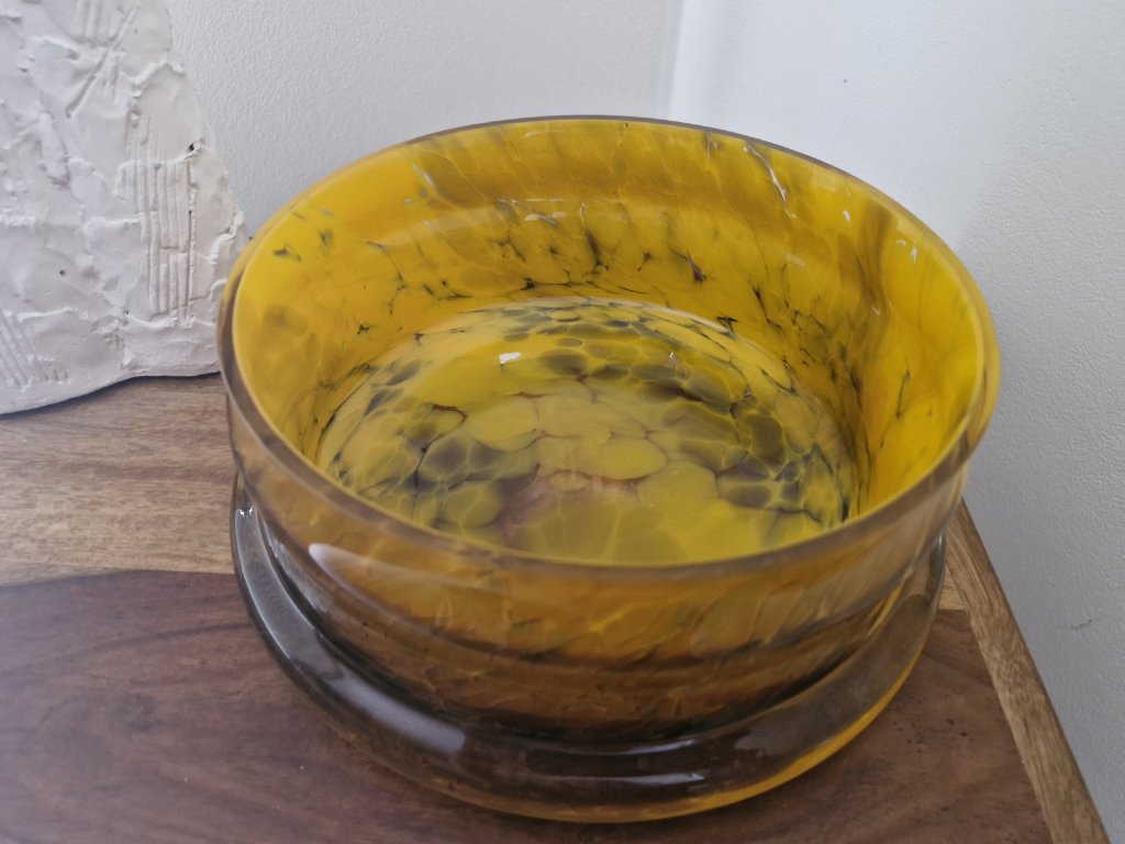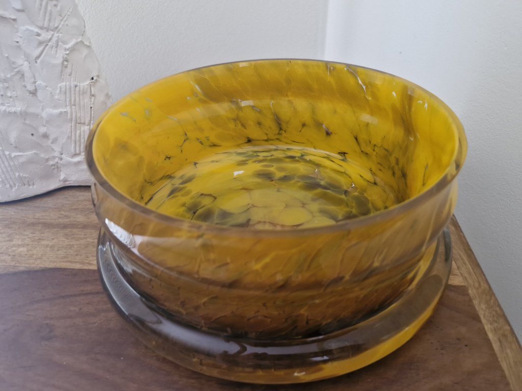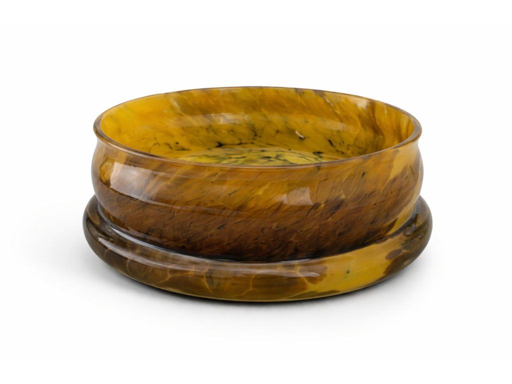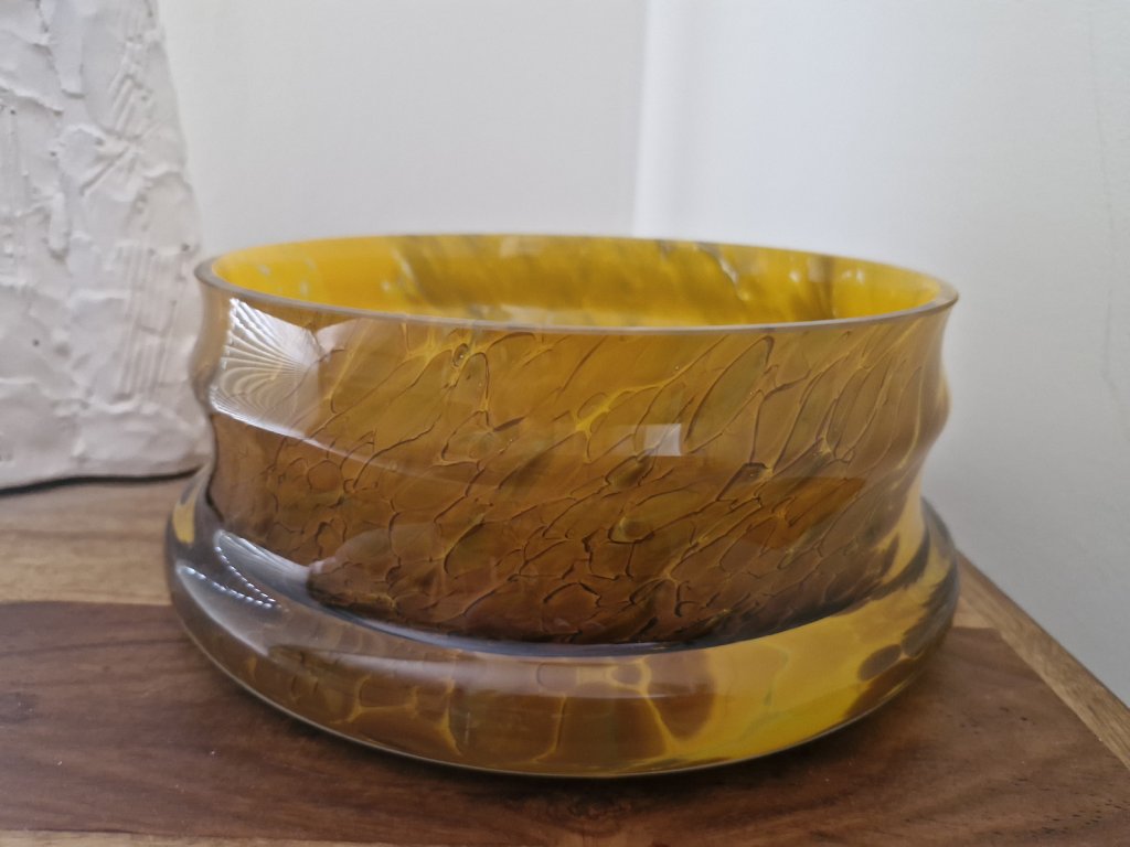 Krásná masivní mísa z hutního skla v kombinaci žluté a hnědé skloviny. Autorský návrh František Koudelka, sklárna Prácheň, 60. léta 20. století. Výška 10 cm, průměr 22 cm. Top stav.