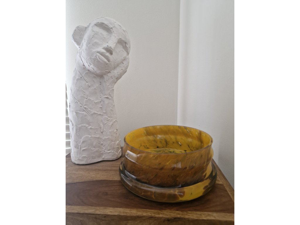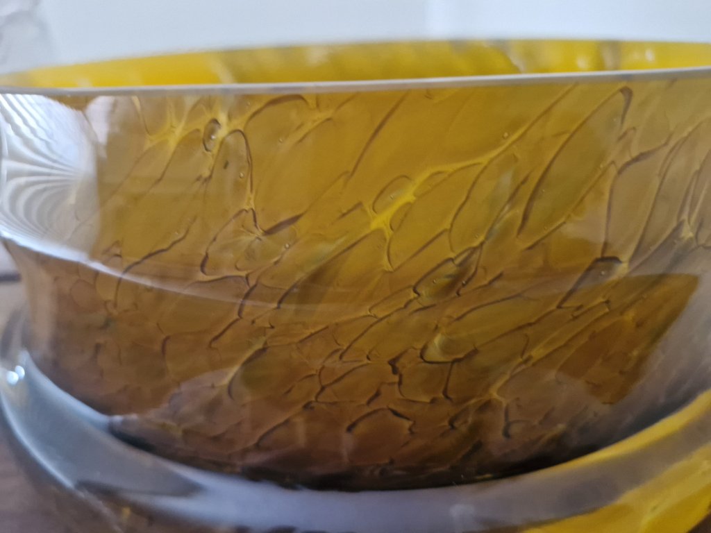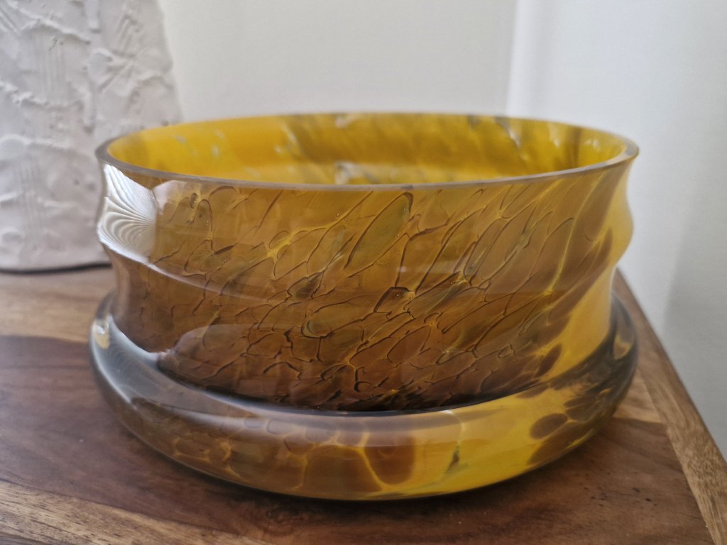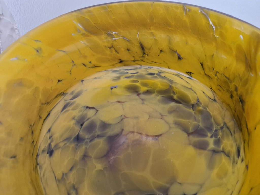 Krásná masivní mísa z hutního skla v kombinaci žluté a hnědé skloviny. Autorský návrh František Koudelka, sklárna Prácheň, 60. léta 20. století. Výška 10 cm, průměr 22 cm. Top stav.